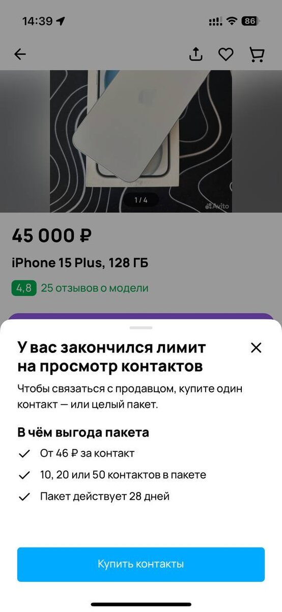 Сегодня я в очередной раз зашел на АВИТО, чтобы полистать айфоны — недавно я нашел себе iPhone 15 после долгих страданий (вот тут подробности), и теперь взялся за поиск телефона для супруги. Процесс это эмоционально затратный: ушлые продавцы-перекупы всячески маскируются под частников, умалчивают подробности о товаре, размещают плохие фотки, чтобы скрыть состояние устройства, а также включают авито-доставку для охватов, но не хотят ею отправлять. Зайдя в первое приглянувшееся за сегодня объявление я хотел было написать продавцу, рассмотрит ли он отправку телефона в мой регион, и увидел следующее: Такой поворот застал меня врасплох. Поначалу я подумал, что это глюк, ведь раньше покупка контактов практиковалась на АВИТО лишь в разделе работы, вакансий и услуг. Там это в целом вполне объяснимо, но в разрезе покупки техники — какой-то форменный бред. Однако оказалось, что это не глюк и не шутка. АВИТО действительно тайком, без предупреждения ввело новое правило — лимиты для покупателей