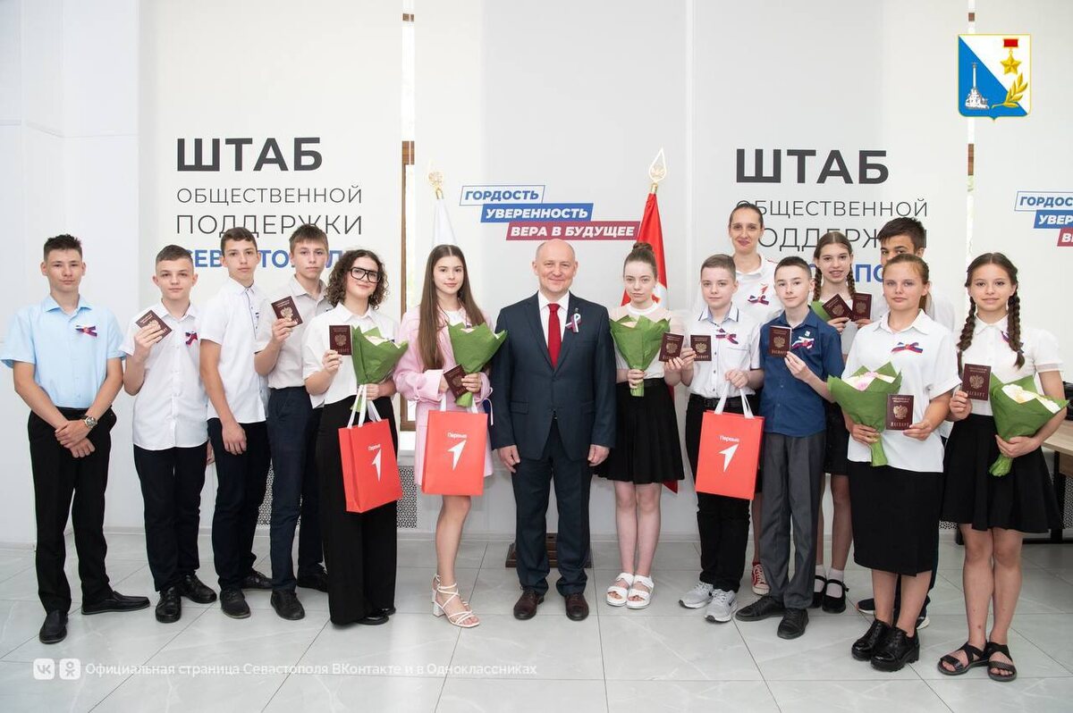 «Мы — граждане России!» Губернатор Михаил Развожаев вручил паспорта 13 севастопольским школьникам. Участники церемонии произнесли торжественное обещание на верность Российской Федерации и вместе спели гимны России и Севастополя. Чтобы получить первый паспорт в праздничный день нужно зарегистрироваться на официальном сайте «Движения Первых» и заполнить заявку в разделе «Активности», выбрав свой регион, подписаться на официальную группу «Движения Первых» в социальной сети «ВКонтакте». Правительство Севастополя