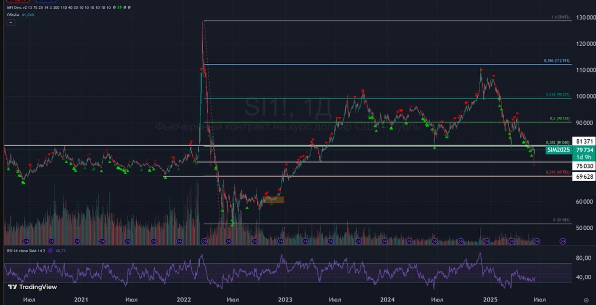 🔤 Доллар-Рубль 🟢 Удивительно, что на фьючерсном графике поддержки совпадают с линиями фибоначчи. Примерно на 81000 проходит мощнейшая поддержка, которая в данный момент пробита, да еще и присутствует шип вниз, который появился, скорее всего, из-за какого-то крупного маржин-кола. 🟢 Пойдет ли цена отрабатывать шип или нет, скоро узнаем. Но пока что у нас появилось на графике бычье поглощение. Последний раз такая формация была 12 марта, но не получила подтверждения. С ноября 2024 года не было больше ни одного такого паттерна. 🟢 Смущает так же то, что на графике юань-рубль в 10 утра не было ни покупателя, ни продавца. Потом стакан зашевелился в 11:30 и пошли вверх. и закрыв фьючерсный график в потолок, а базовый график так и остался без красивого закрытия. 🚗 Итого, во вчерашнем взлете много странностей: ©️Рост как обычно в выходной или предвыходной день, когда крупный игрок отдыхает на яхте. ©️Базовый график закрылся без позитива, но фьючерсы загнали вверх ©️Основные объемы пошли