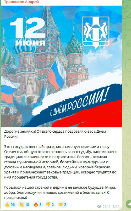 Несколько сибирских губернаторов пожелали мира на День России Главы регионов Сибири поздравили жителей с Днём России 12 июня. С одной стороны тексты получились очень похожими, с другой — в некоторых нашлись пожелания мира. «Мира, добра, благополучия и новых достижений в благих делах», — говорится в телеграм-канале новосибирского губернатора Андрея Травникова. «В этот день я желаю всем нам добра, мира и новых свершений», — сказал на видео глава Кузбасса Илья Середюк. «Дорогие земляки! От всей души желаю вам успехов, «Крепкого здоровья, мира и добра» пожелал глава Тувы Владислав Ховалыг. Омский губернатор Виталий Хоценко написал о «преодолении всех трудностей» в «единстве», глава Хакасии Валентин Конолов решил вспомнить про Советский Союз. Красноярский губернатор Михаил Котюков — про «национальные интересы на международной арене». В поздравлении губернатора Томской области Владимира Мазура на сайте его администрации написано: «Как сказал наш Президент Владимир Владимирович Путин,