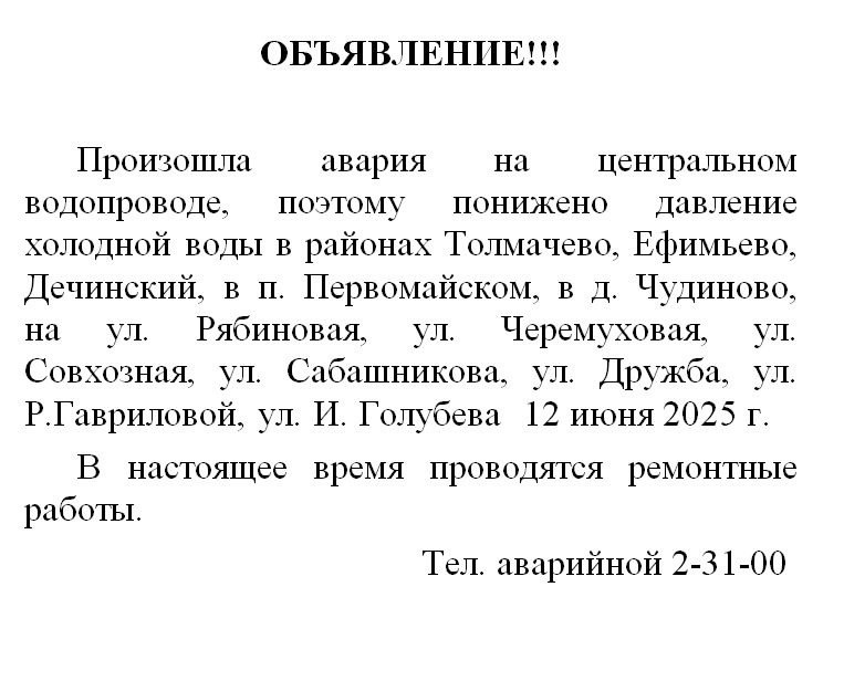 ОБЪЯВЛЕНИЕ!!! Произошла авария на центральном водопроводе, поэтому понижено давление холодной воды в районах Толмачево, Ефимьево, Дечинский, в п. Первомайском, в д. Чудиново, на ул. Рябиновая, ул. Черемуховая, ул. Совхозная, ул. Сабашникова, ул. Дружба, ул. Р. Гавриловой, ул. И. Голубева 12 июня 2025 г. В настоящее время проводятся ремонтные работы. 🚩Подписаться на новый Вязниковский ТГ-канал