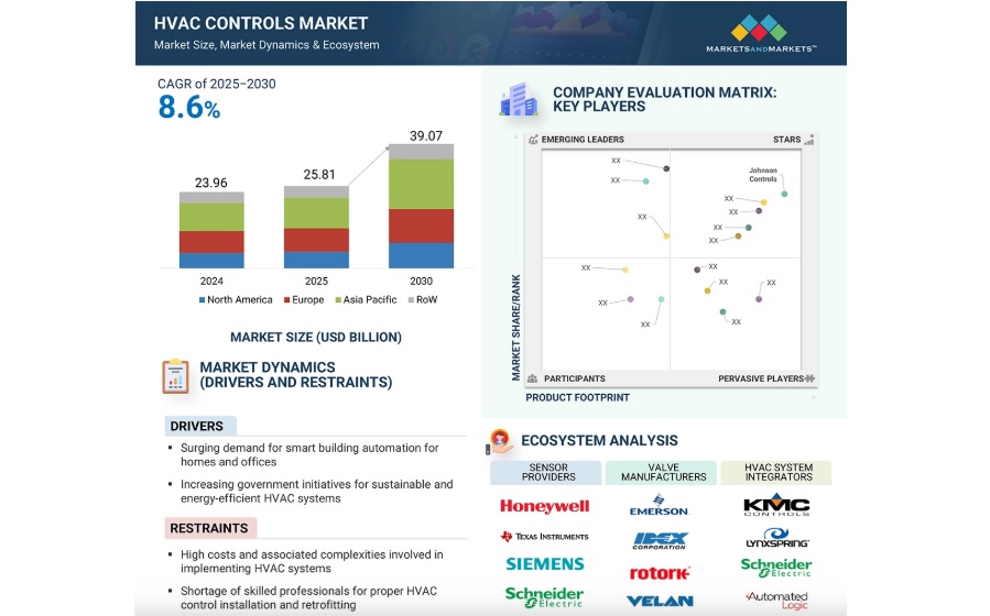 По данным отчета компании MarketsandMarkets, глобальный рынок систем управления отоплением, вентиляцией и кондиционированием воздуха (HVAC) вырастет с $25,81 млрд в 2025 году до $39,07 млрд к 2030 году, при среднегодовом темпе роста (CAGR) 8,6%. Основными драйверами роста выступают растущий спрос на энергоэффективные HVAC-системы, быстрая урбанизация и активное строительство. Увеличение численности городского населения и рост инфраструктурных проектов стимулируют внедрение систем управления HVAC, обеспечивающих оптимизацию энергопотребления, повышение комфорта в помещениях и соответствие экологическим стандартам. Ожидается, что сегмент датчиков будет расти быстрее других в течение прогнозного периода. Датчики играют ключевую роль в системах управления HVAC, собирая данные о температуре, влажности, качестве воздуха и присутствии людей. Развитие технологий Интернета вещей (IoT) и беспроводной связи способствует интеграции «умных» датчиков, которые улучшают работу систем, снижают энергопо