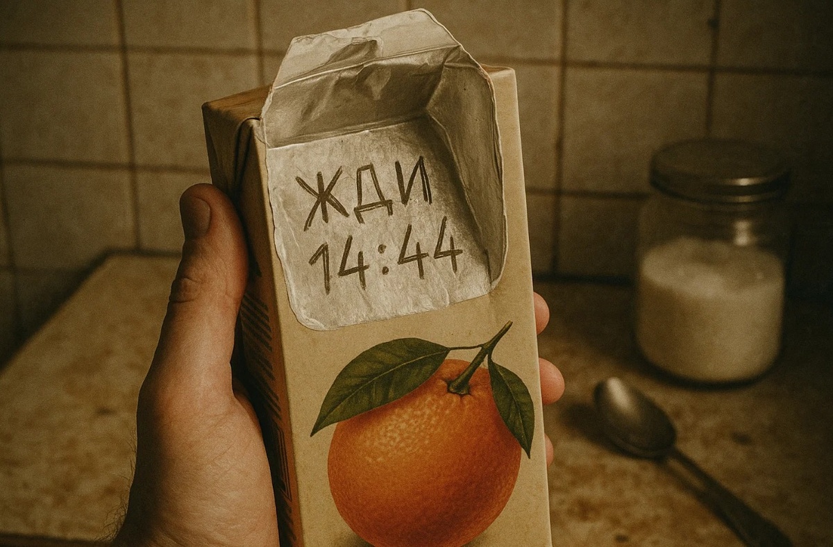 Я допивал обычный сок из пакета и заметил на внутренней стороне надпись: “Жди 14:44”. Буквы были будто выцарапаны изнутри. Я вылил остатки, разрезал упаковку — надпись была настоящей. В 14:44 в тот же день позвонили в дверь. Один раз. В глазке — никого. На записи с камеры — тоже. Потом это повторилось. Я до сих пор не знаю, что это было. Но упаковку я сжёг. Я допивал сок. Самый обычный, из пакета. Утро было как утро — серое, мутное, я не выспался. Вскрыл пачку вчера вечером, в холодильнике стояла ночь, а с утра допивал прямо из горлышка. Холодный, терпкий. Не свежевыжатый, конечно. Но пить можно. Сделал глоток, покрутил упаковку — посмотреть, сколько осталось. Свет из окна падал сбоку, и я заметил, что внутри, на внутренней стороне пакета, что-то… тёмное. Сначала подумал — осадок, капли, разводы. Потом понял — буквы. Почти на стенке, с левой стороны, ближе к углу. Смотрелось как царапины. Но слишком ровные. Подошёл ближе к окну. Покрутил. Под нужным углом — читается. Жди 14:44 Всё. Бол