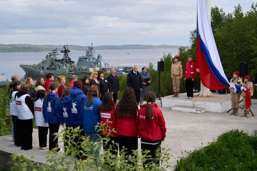 🇷🇺Сегодня утром в честь государственного праздника – Дня России на всех боевых кораблях и судах обеспечения Северного флота были вместе с Андреевским флагом были подняты российский триколор и флаги расцвечивания Гигантский российский флаг взвился и над Североморском. Церемония его подъема на флагштоке мыса Алыш состоялась в 9 утра.