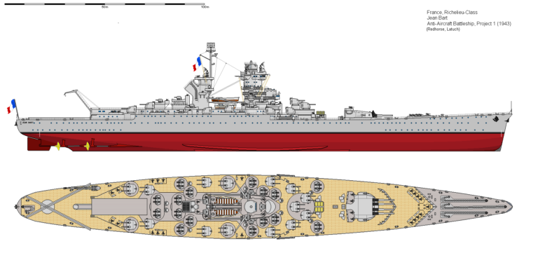 Как известно, до начала войны французы так и не успели достроить второй линкор класса «Ришелье» «Жан Бар». После захвата Франции, «Жан Бар» был переведён в Касабланку, где его пытались всё же достроить. В это время степень готовности корабля была достаточно высокой, на нём была установлена только одна главная башня и несколько зенитных орудий. Именно в это время и возникли проекты по достройке линкора, так сказать в урезанном виде. Понятно, что вторую башню ГК взять было не где. Поэтому поступило предложение достроить линкор с одной башней, а высвободившейся вес заполнить зенитными и универсальными пушками, получив таким образом корабль до этого невиданного класса – линкор ПВО. Предложение было следующим. Кроме одной башни ГК удалить с корабля и все 152-мм и 100-мм пушки. А вместо них поставить 15×2 универсальных 127-мм орудий американского производства и 16х4х40-мм зенитных пушек «Бофорс». Ну и завершить зенитное вооружение корабля должны были 28х20-мм в одиночных установка, так же ам