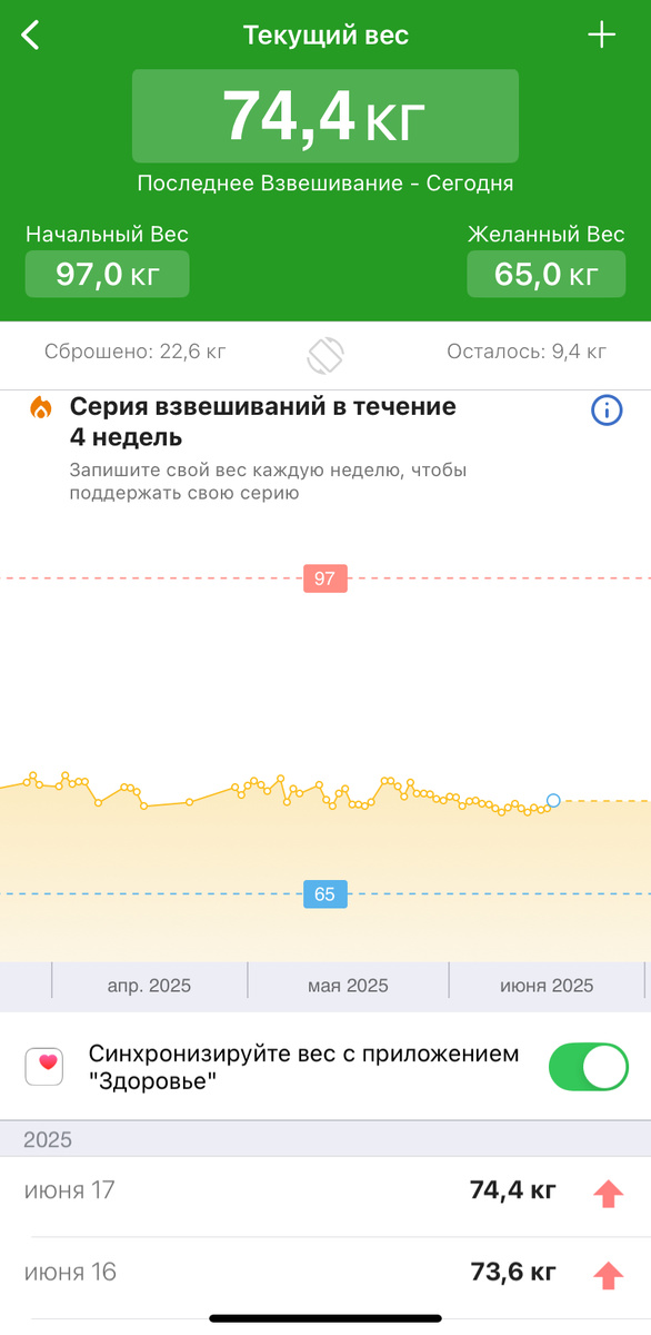 Приветствую вас на моем канале. Меня зовут Юля. Мне 34 года. Я худею с 97 килограмм. Моя цель 65 килограмм. Я худею на подсчете калорий. На данный момент я сбросила больше 22 килограмм. Я не беру свой метод похудения за рекомендацию для всех. У каждого своя физическая активность и норма калорий, аллергии и пищевые непереводимости. Фото тарелок это то, чем я действительно питаюсь: как пример, что можно худеть и на обычной еде, которую вы готовите для всей семьи. Плюс на моем канале вы найдете много интересных и простых рецептов. Мой вес на сегодня: 73,2 Рада вас видеть на моем канале. Вот и прошла еще одна неделя на дзен. Вас становиться больше и это меня очень радует. Вес теперь гуляет вокруг 73,2-74,5 килограммов. Не останавливаюсь и двигаюсь дальше. Цель к концу марафона 70 килограмм, но я хочу быть гораздо меньше. Замеры тоже потихоньку уходят, но и Москва не сразу строилась. Самое мое проблемное место целый минус 1 сантиметр. Вот это не может ни радовать. Я переделала табличку, чт