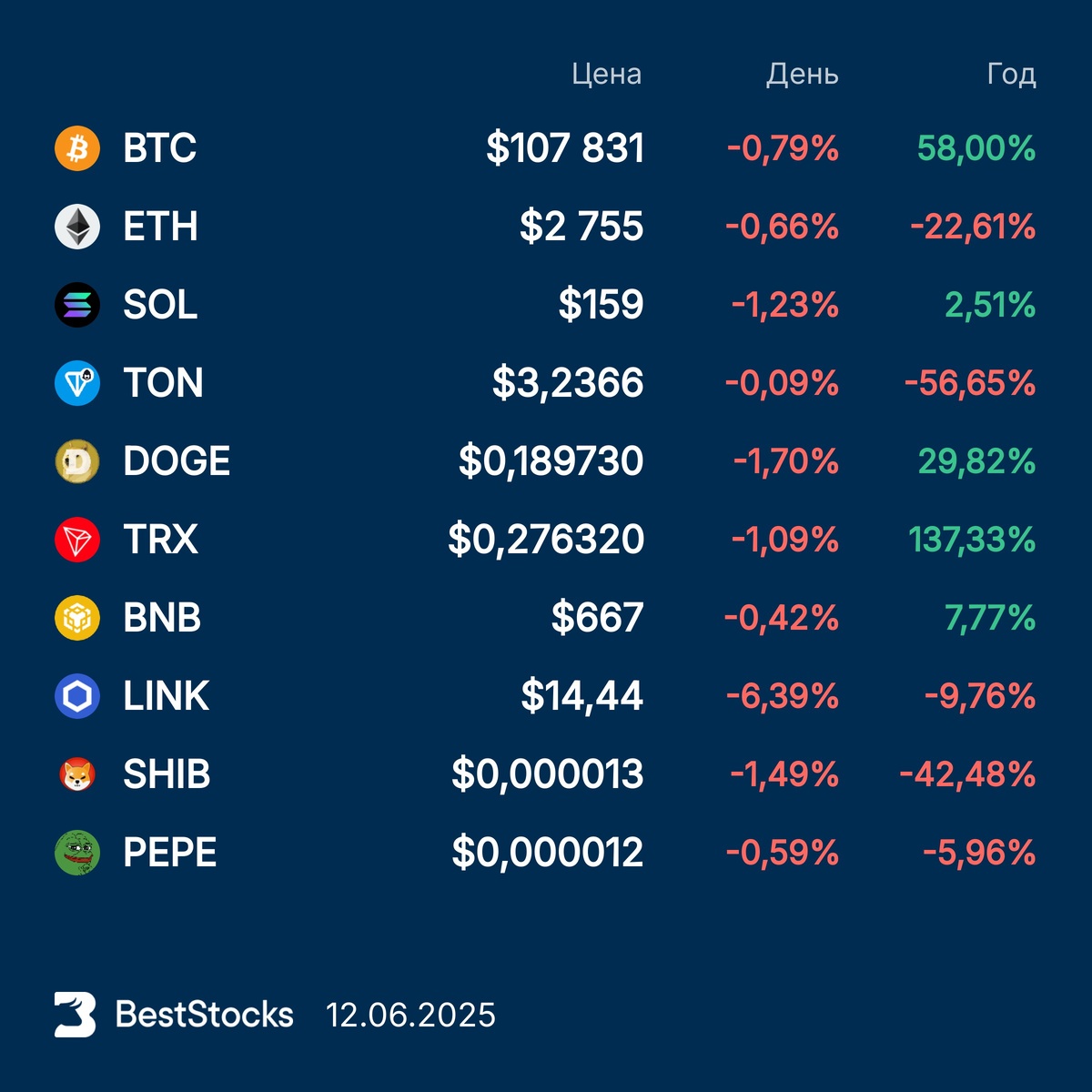 Курсы основных криптовалют: Bitcoin, Etherium, Solana, Toncoin, Dogecoin, TRON, BNB, Chainlink, Pepe, Shiba Inu на текущий момент #крипта #crypto #курс #BTC #ETH #SOL #TON #DOGE #TRX #BNB #LINKUSD #PEPEUSD #SHIBUSD ••••• ❓ Брокер перестал показывать стоимость портфеля? Это можно исправить — BestStocks сделал специальный бесплатный инструмент, который показывает стоимость всех акций в вашем портфеле в реальном времени. Попробовать бесплатно