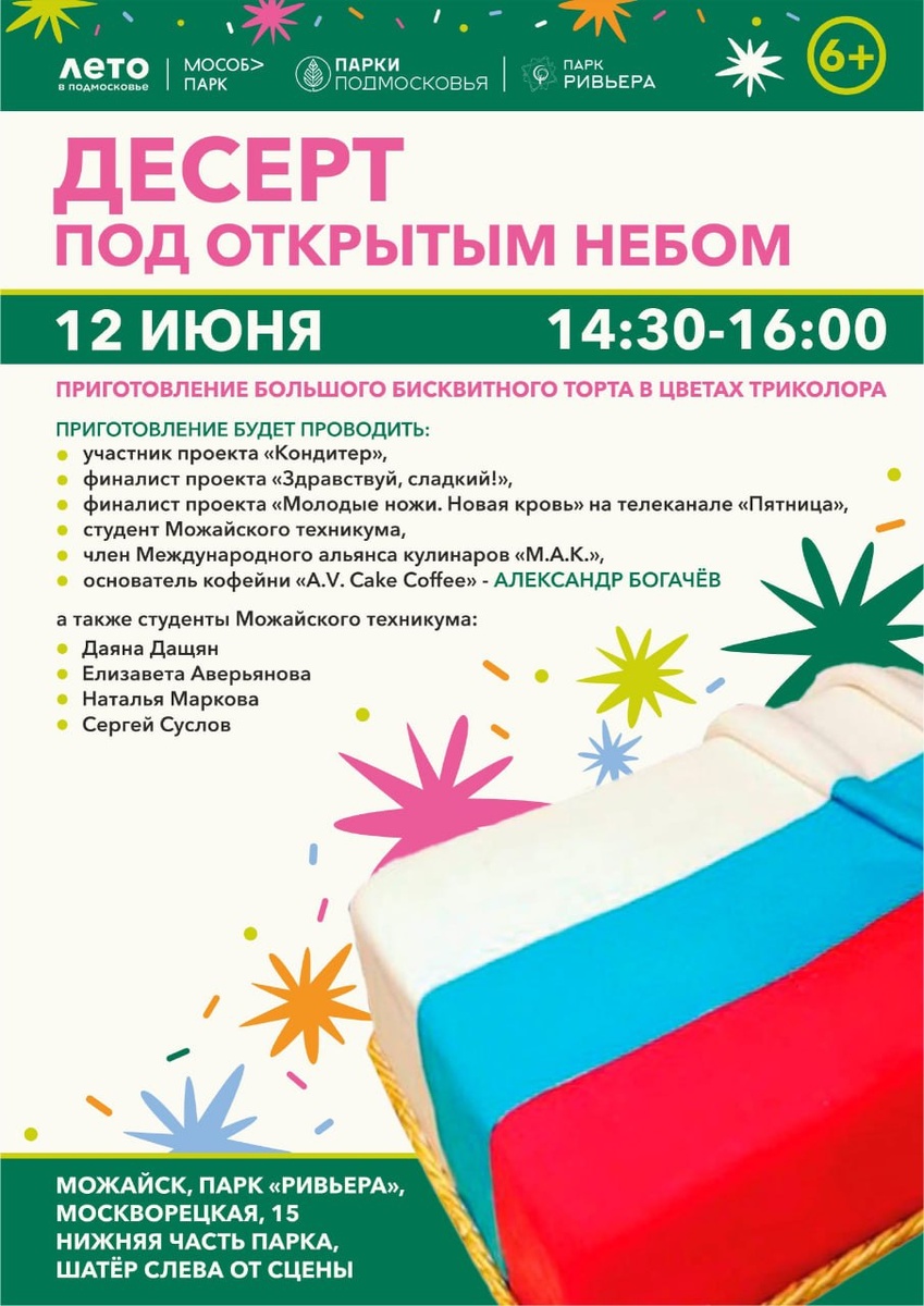 12 июня парк «Ривьера» приглашает на празднование одного из главных праздников нашей Родины – Дня России. Команда кондитеров из студентов Можайского техникума во главе с шеф-поваром Александром Богачевым приготовят большой бисквитный торт и угостят им всех гостей праздника. Кулинарный шедевр будет выполнен в цветах триколора и поразит всех своей изысканностью и нежным вкусом.