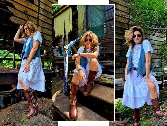 Телеведущая Жанна Бадоева не перестает показывать образы, которые тут же хочется повторить. И, что самое главное, сделать это несложно! Недавно звезда поделилась с подписчиками фото со съемок программы про Парагвай. Фолловеры потеряли покой. «Жанна, вы обворожительны!», «Жанночка, супер! Сапоги шикарные, как и хозяйка», «Красотка, как всегда! Сапоги отпад», — не унимаются они. Что ж, попробуем собрать похожий аутфит! Начнем с самой простой позиции. Белая базовая футболка нашлась в Sela — она плотная, не просвечивает, свободного кроя и со спущенным плечом. Если хочется вариант «аккуратнее», приглядитесь к модели Kira slim fit — хроша в качестве первого слоя. Летняя ярусная юбка плиссе ждет на Wildberries — посадка средняя, длина универсальная, рейтинг 4,8. В отзывах пишут, что качественная и хорошо садится на высоких. Симпатичный джинсовый жилет с глубоким V-образным вырезом есть в Befree — он достаточно плотный, но при этом в нем не жарко, сшит из денима на основе хлопка. Если хочется