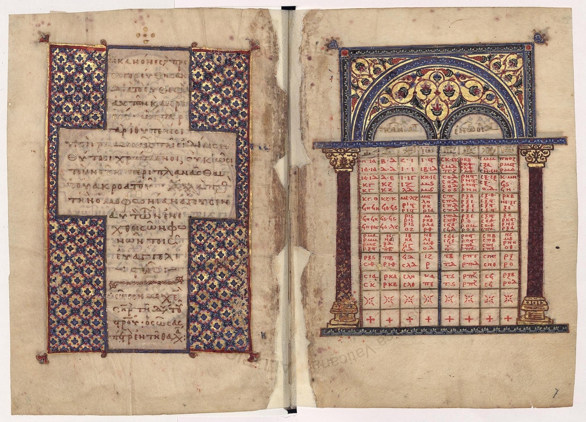 Р. В. Мантай - исследователь книжной миниатюры. Каноны Евсевия — система ссылок между параллельными местами четырёх Евангелий разработанная в первой половине IV века отцом церковной истории Евсевием Кесарийским. Таблицы были адресованы в письме некоему Карпиану, поэтому перед таблицами канонов зачастую размещается текст послания Карпиану. Таблицы канонов быстро обретают популярность и художественное оформление в традиции иллюстрирования Четвероевангелий. Встречается уже в самых ранних иллюминированных рукописях из дошедших до нас, начиная с конца V века. По самому древнему иллюстрированному Евангелию Аввы Гаримы (Эфиопия кон. V – нач. VI вв.) видно, что оформление канонов было уже весьма устоявшимся, высоко художественным и парадным. Широкое распространение получает в византийских, латинских, эфиопских, сирийских, грузинских и армянских книжных традициях. Самое раннее изображение Евсевия Кесарийского находится в сирийском Евангелии Раббулы 586 года. Евсевий изображен вместе с Аммонием