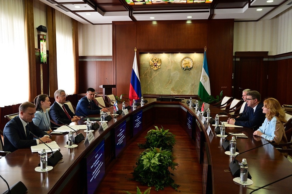 Руководитель Башкирии Радий Хабиров 12 июня в Доме Республики встретился с председателем Минского городского исполнительного комитета Владимиром Кухаревым, который возглавил делегацию Беларуси для участия в Днях столицы братской республики в Уфе. «Мы очень рады приветствовать вас в нашей республике. Вместе с вами встречаем День России и День города — столицы Башкортостана. Мы плодотворно взаимодействуем с Беларусью в части экономического сотрудничества, туристического и культурного обмена. Крупный бизнес и предприниматели региона заинтересованы в развитии своей деятельности в Минске и других городах. Уверен, что при вашей поддержке эти инициативы будут успешно реализованы», — сказал Радий Хабиров. Председатель Минского горисполкома поздравил жителей республики с Днем России и Днем Уфы. «Сегодня знаменательный день для Российской Федерации. Посольство России в Минске также организует торжественные мероприятия. А участие в праздничной программе в честь Дня города позволило нам увидеть, к