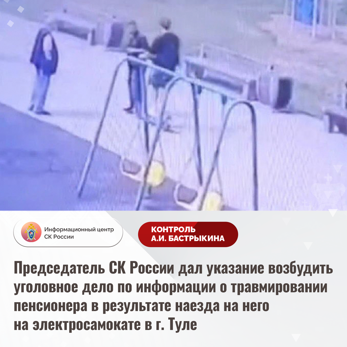 Председатель СК России дал указание возбудить уголовное дело по информации о травмировании пенсионера в результате наезда на него на электросамокате в г. Туле В сети Интернет сообщается о травмировании жителя города Тулы в результате наезда на него электросамокатом. В июне текущего года водитель средства индивидуальной мобильности сбил 66-летнего мужчину, после чего скрылся с места происшествия. Пенсионеру потребовалась медицинская помощь. В СУ СК России по Тульской области по данному факту начата процессуальная проверка. Председатель Следственного комитета Российской Федерации Александр Иванович Бастрыкин дал указание руководителю СУ СК России по Тульской области Владимиру Владимировичу Усову возбудить уголовное дело и представить доклад о ходе и результатах его расследования. Исполнение поручения поставлено на контроль в центральном аппарате ведомства. #СледственныйКомитет #СКРоссии #СКР #ИЦСКР #ИнформационныйЦентр #АлександрБастрыкин #ПредседательСКР #КонтрольПредседателяСКР #Коммен
