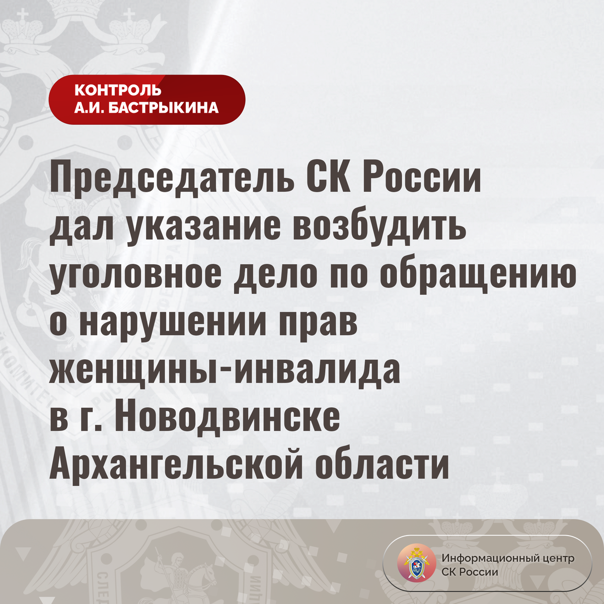 Председатель СК России дал указание возбудить уголовное дело по обращению о нарушении прав женщины-инвалида в г. Новодвинске