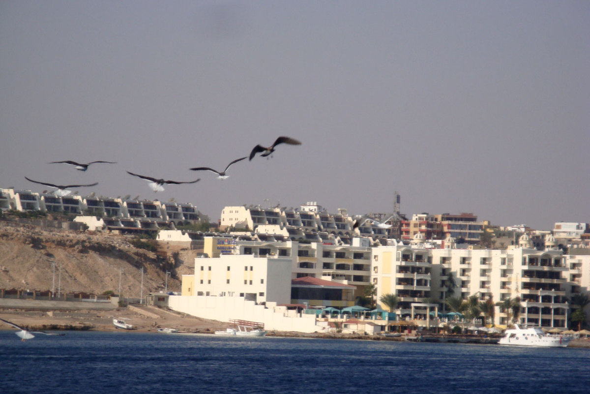 Проплывали мимо шикарного курорта для очень богатых Эль Гуна, даже со стороны видно, как там красиво обустроен берег, украшен пальмами и зонтиками. Эль Гуну называют египетской ривьерой, но точнее было бы назвать египетской Венецией. Все отели находятся на небольших островках, соединённых между собой мостами и каналами, по которым курсируют лодки.