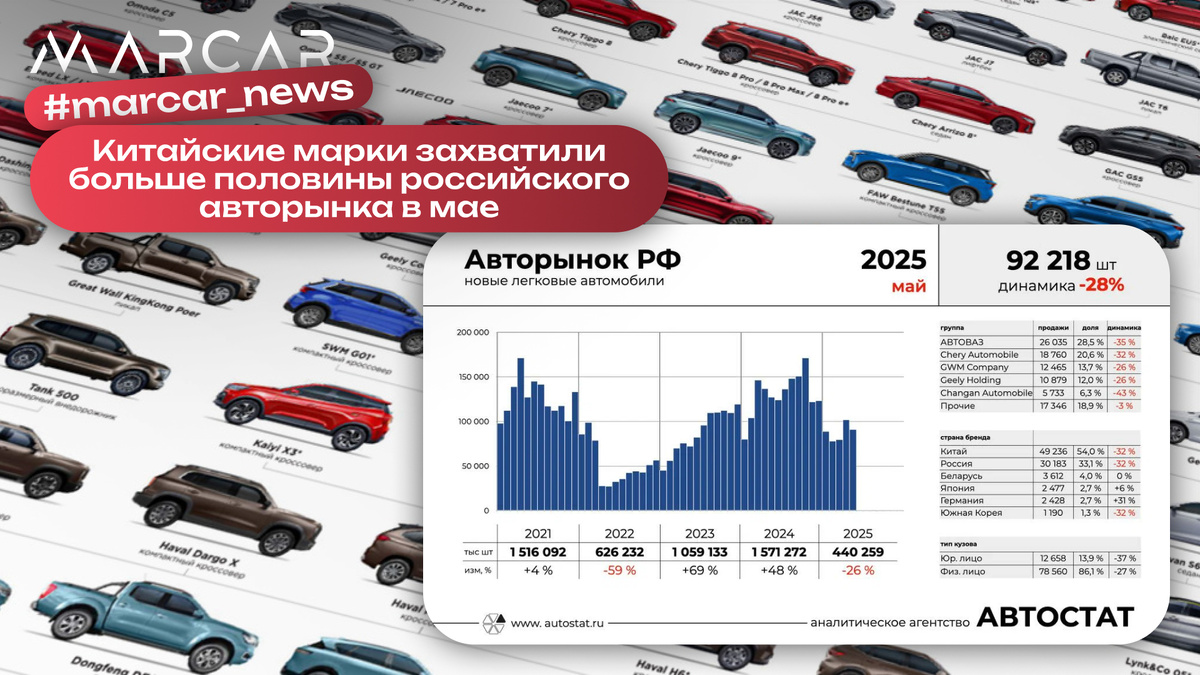 Второе место занял российский автопром, включая новые отечественные марки, с долей 33,1%. Но и здесь продажи сократились на 32% — до 30 183 автомобилей. Среди других стран-поставщиков выделяются: Вместе они обеспечили 9 707 продаж. Общий объём рынка в мае составил 92 218 новых машин, что на 28% меньше, чем год назад. Среди лидеров по производителям — АвтоВАЗ, а также китайские Chery, Great Wall Motor, Geely и Changan, но спрос на их модели также снизился на десятки процентов. Подпишись, если интересуешься автомобильной тематикой и следи за новостями! ✅ 📲 Запишитесь в наш автосалон на просмотр автомобилей и тест-драйв: +7(931)108-07-61 #marcar_news