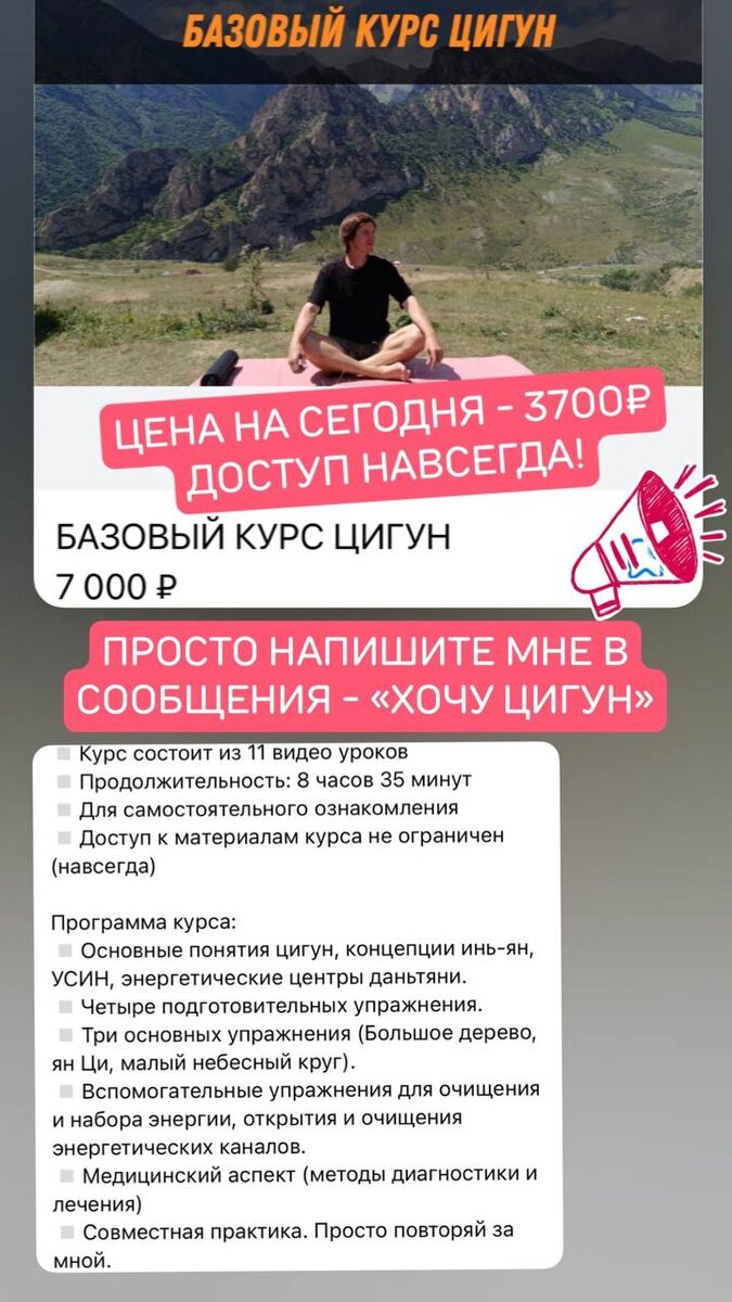 БАЗОВЫЙ КУРС ЦИГУН - 11 видео уроков - более 8,5 часов - доступ навсегда Стоимость на сегодня - 3700₽ (вместо 7000₽) ✅Просто напишите мне - «Хочу цигун»