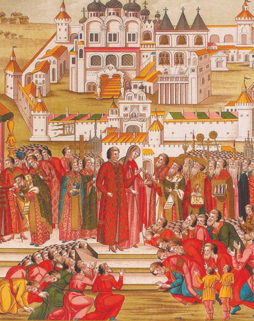 А на Соборе были Московского Государства изо всех городов Российского Царства власти: Митрополиты, Епископы и Архимандриты, Игумены, Протопопы и весь Освященный Собор; Бояре и Окольничие, Чашники и Стольники и Стряпчие, Думные Дворяне и Диаки и Жильцы; Дворяне большие и Дворяне из городов; Дияки из Приказов; Головы стрелецкие, и Атаманы Казачьи, Стрельцы и Казаки торговые и посадские; и Великих чинов всякие служилые и жилецкие люди; и из всех городов Российского Царства выборные люди.