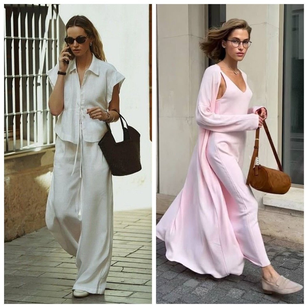 Разумеется, летом хочется ярких и сочных цветов, которые повышают настроение. Но выглядеть элегантной леди в неоне точно не получится. Поэтому предлагаю заменить их на базовые оттенки — молочный, бежевый, жемчужный, в деликатную полоску или любая пастель с преобладанием белого пигмента.