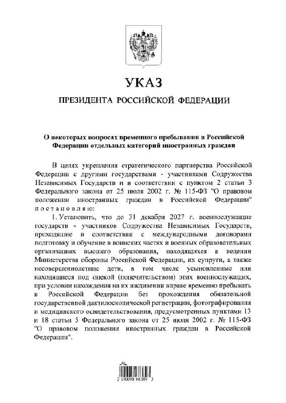 Военные стран СНГ, обучающиеся в России, а также их семьи могут до конца 2027-го временно находиться в России без дактилоскопической регистрации, соответствующий указ подписал Путин