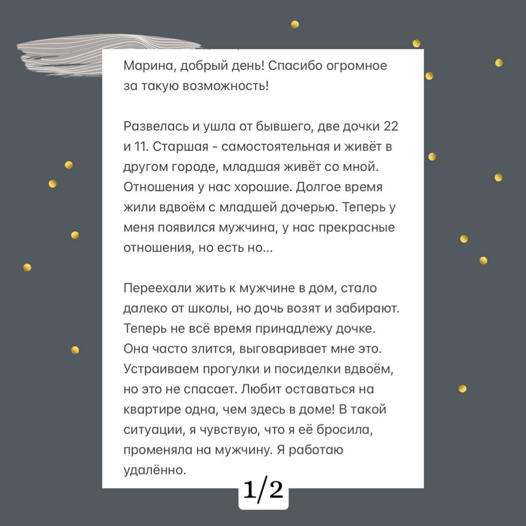 Вопрос от подписчика: Мой ответ: Пожалуйста ❣️ мне приятно отвечать для вас ( это обращение ко всем потому что я не вижу авторов писем) Про дочку Если мужчина вам дорог, если вы решили, что он будет в вашей жизни долго и у вас есть обоснования (для себя) почему он лучший мужчина на данном этапе, то с дочке придется принять тот факт, что мама не будет с ней 24/7 ▪️Неприятно это для нее? ▫️Да, неприятно ▪️Обязаны ли вы во что бы то ни стало отказываться от своей личной жизни? ▫️Нет не обязаны Ждать, что дочь просто так возьмет и примет убавление вас в ее жизни не стоит Что делать? 💬Неплохо работают контрасты. Когда мамы еще меньше становится в жизни и тогда то, как есть сейчас начинает цениться больше. 💬 Второй вариант что-то вроде вердикта: «Дочь, я понимаю, что ты злишься, я понимаю, что тебе хотелось бы оставаться со мной дольше и чаще. Но так уж вышло, что теперь в моей жизни есть (…) и часть своего времени я буду проводить с ним. Это ни как не влияет на мои ч