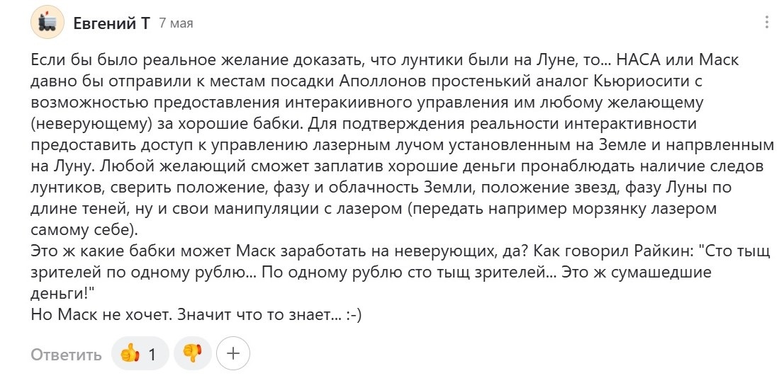Что увидит человеческий глаз, или камера лунохода, когда лазерный луч достигший Луны "расползется" по площади в 1,6 км? Ничего. На такой луноход придется ставить дополнительное оптическое оборудование для детектирования фотонов пришедших от лазера расположенного на Земле. А это плюс к массе самого лунохода. А на Земле для удовлетворения хотелок наших немогликов придется строить специальную обсерваторию, дабы никто не даст доступ к имеющимся обсерваториям ради проведения ежедневных шоу для неверующих. Строительство такого объекта потребует очень больших денежных средств исчисляющиеся миллиардами долларов.
