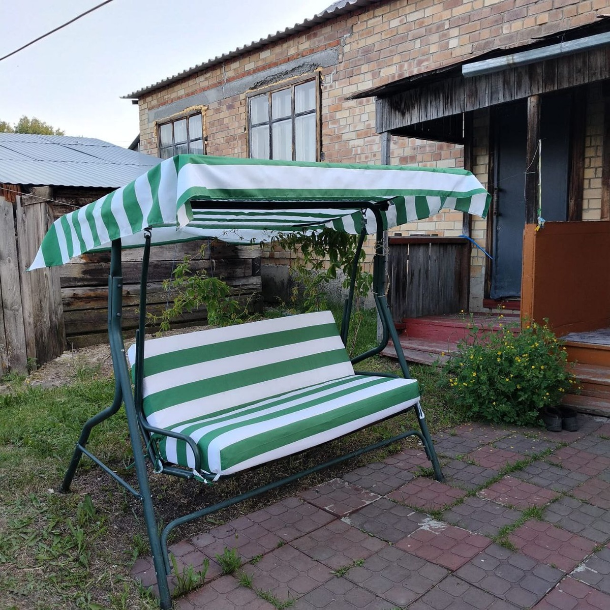 Сидушка и приспинная подушка изготовлены из поролона толщиной 10 см и 8 см соответственно, сшиты новые чехлы на молнии, а также новая крыша качели.
