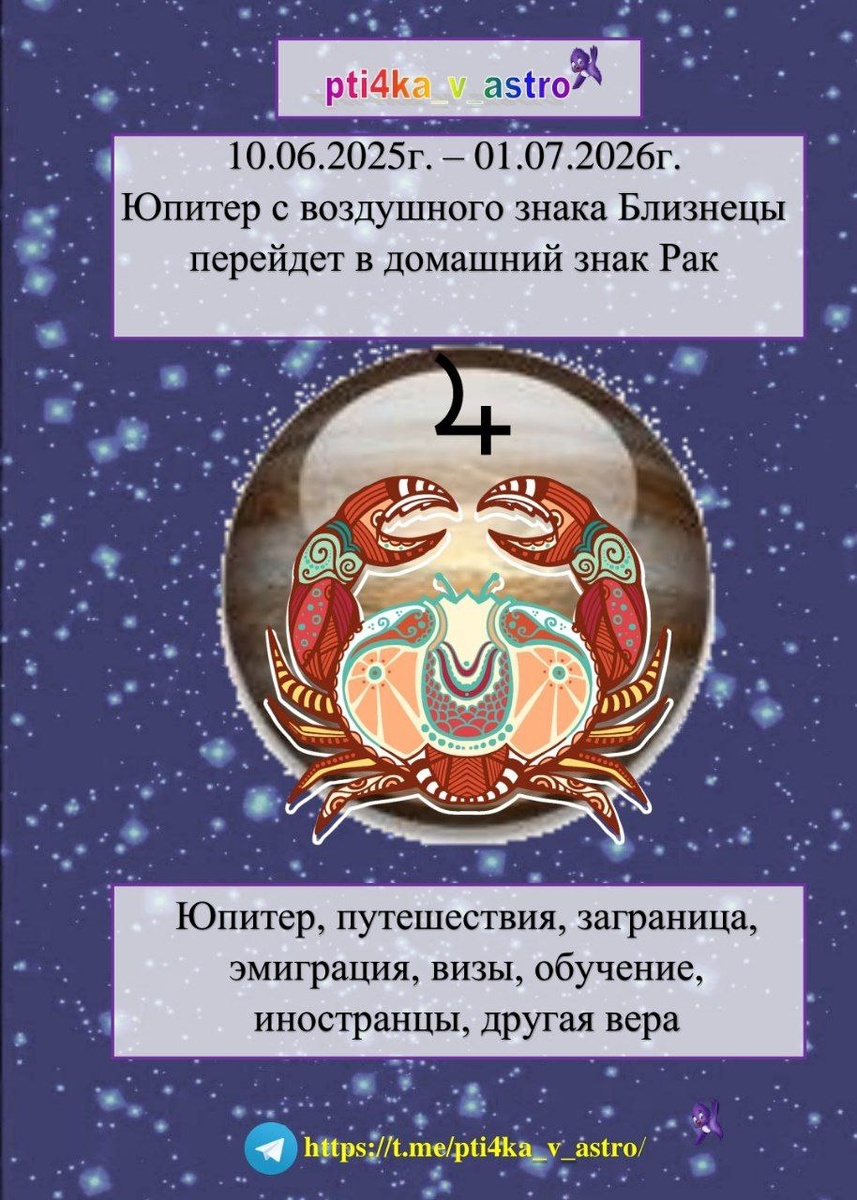♃♋ Юпитер в Раке С 10.06.2025г. 00:01:56 мск по 30.06.2025г. 08:52:04 мск ♃ Юпитер - планета законов, норм, правил, детей, обучения и духовности 🏠 Зашла в домашний, семейный и уютный знак Рак ♋ 🏡 На первое место выйдут темы: семьи, детей и Родины 🇷🇺 💸 Появится уверенность и желание, что-то делать для улучшение жилищно-бытовых условий и извлечения прибыли 💹 🏗️ Деятельность может быть связана со строительством, ремонтом, детьми, образованием, общепитом👩🍳 🌳 Будет развиваться семейный бизнес и работа на дому 📚Появится желание больше узнать о своих корнях и месте жительства 🦋 Появится возможность для проработки блоков, которые мешают идти уверенно по жизни 🐥 Предлагаю к просмотру ваши натальные карты по детским травмам и пути их исправления за 2508р. 🎁Можете воспользоваться за 1808 руб. 💸 Ваши и детей знания - это путь к финансовой свободе! 🐣 Предлагаю посмотреть "куда направить ребенка учиться" - 3508 руб. 🎁Можете узнать за 2508 рублей ☀️Предложение актуал