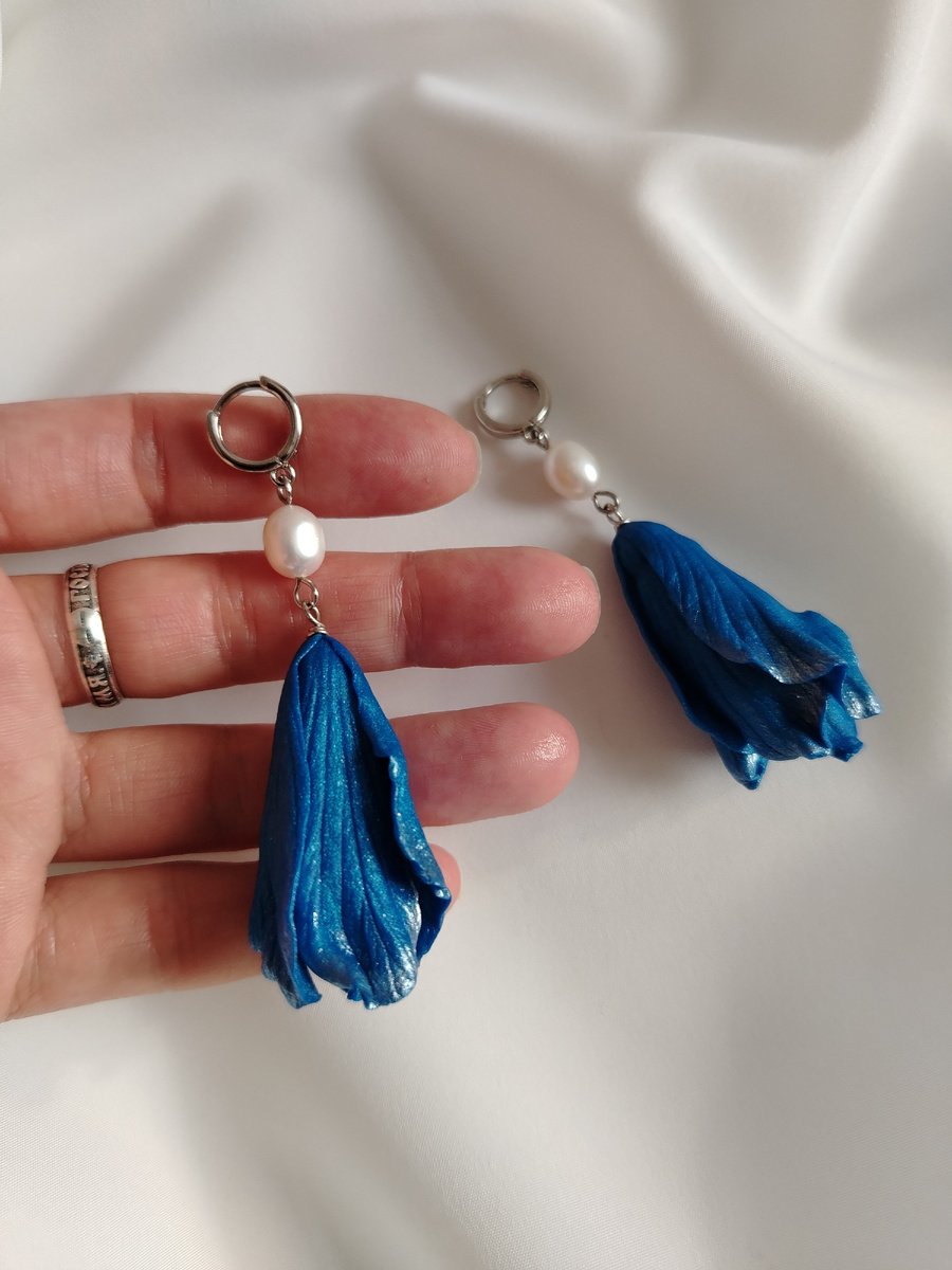 Алла написала перед днём рождения - искала синие серёжки под белую футболку и синие брюки. Я предложила синие цветочные сережки, показала пример. Алла написала, что они ей сразу "отозвались". Я попросила фото ткани брюк, чтобы попасть в оттенок.