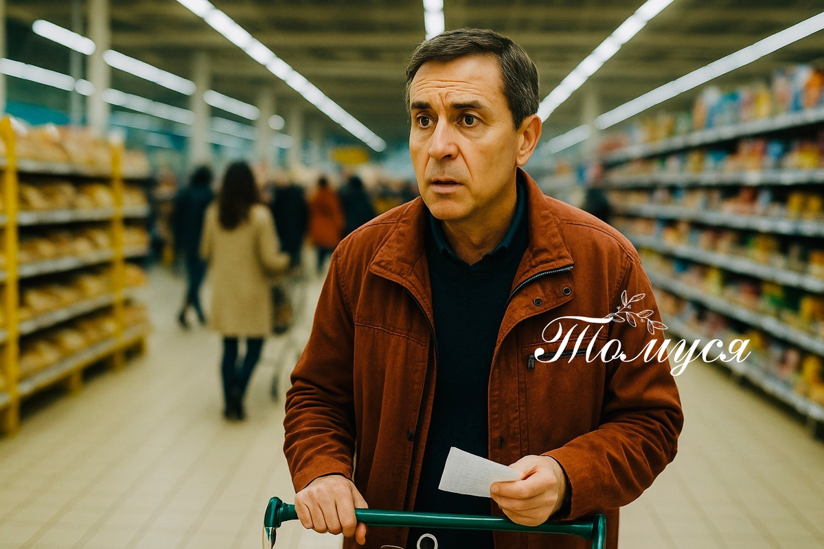 Голос его терялся среди гула покупательской толпы торгового центра, растворялся в звуках сканеров и детских криков. Тележка с покупками послушно следовала за ним, её колёсики монотонно постукивали по кафельному полу.