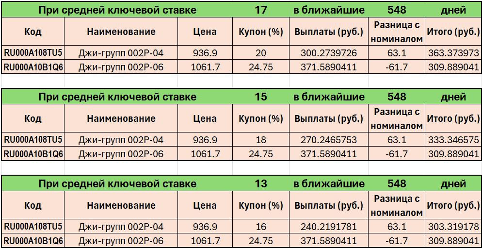 😉 Приветствую, дорогие читатели! Примите искренние поздравления с праздником - хорошо отметить! А пост сегодняшний будет в какой-то степени экспериментальным, ибо попробуем мы с вами порассуждать, стоит ли вообще брать флоатеры на текущем рынке. Оговорюсь сразу - суть своего повествования я попробую изложить с точки зрения простых расчетов, которые могут быть не идеальными, поэтому на недочеты не стесняйтесь указать. Как я и говорил много раз, учусь и не боюсь ошибаться :) 😉 Тем не менее, давайте ближе к сути. Безусловно, достаточно легко на текущем рынке жить с портфелем, который полон бумаг с купонами 24-25% в выпусках эмитентов 🅰️🅰️ и 🅰️, набранных по номиналу. Но вот что делать сейчас, если очень хочется что-то купить? И тут на помощь могут прийти выпуски с плавающим купоном. ▶️ Сравнение проведу на паре бумаг от ДЖИ ГРУПП: - флоатер 002Р-04 $RU000A108TU5, купон КС + 3%, цена в рублях - 936,9 - фикс 002Р-06 $RU000A10B1Q6, купон 24,75%, цена в рублях - 1061.7 ⏺️ Амортизаций нет