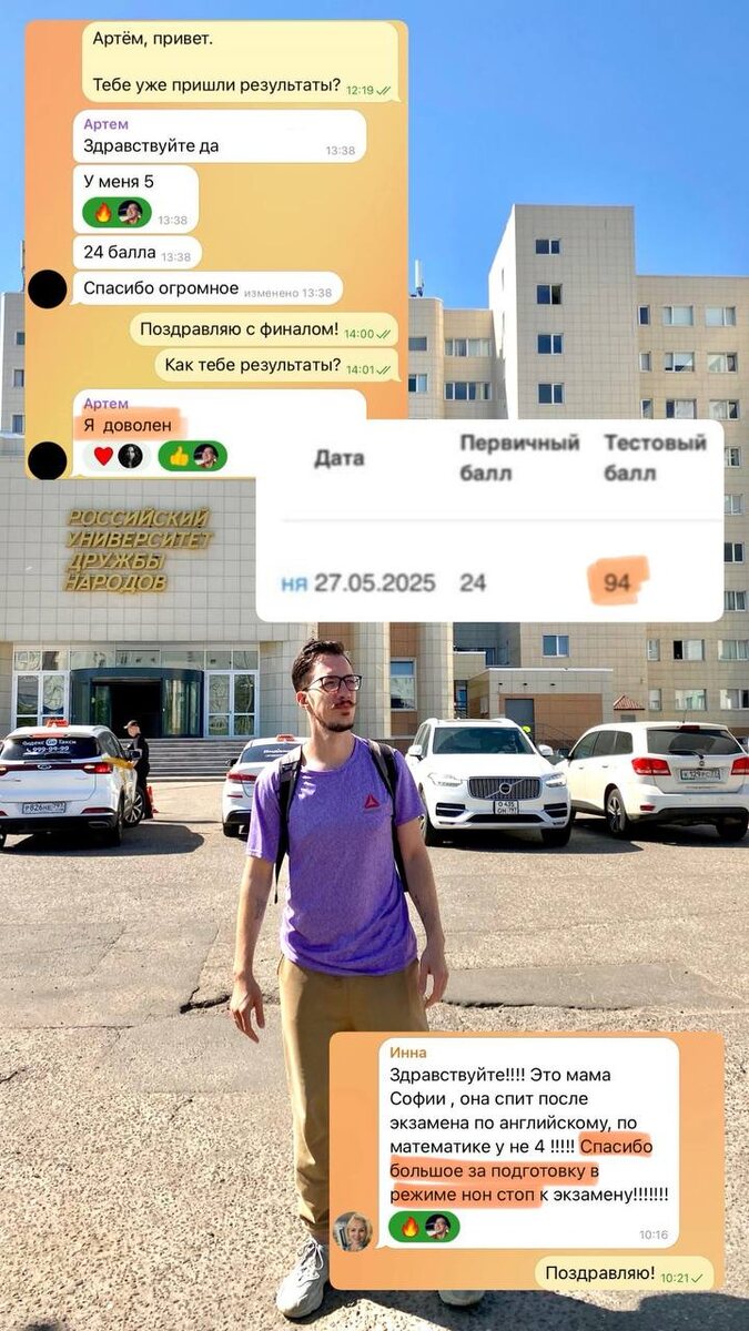 Группа, всем привет. Меня зовут Дрюк Сергей Андреевич — репетитор по математике. Результаты некоторых моих учеников по математике в этом году (все они на фото): 🎉Ученик 1 ЕГЭ профиль Пробник в апреле в 10 кл: 72 Работа: занятия 1 р/нед с середины 10 кл, до молекул разобрали 1-ю часть, системно подошли к алгебре и геометрии 2-й части, 120+ д/з, параллельно занималась в онлайн-школе Пробник в мае в 11 кл: 96 ЕГЭ-2025 профиль: 94 🎉Ученик 2 ОГЭ Пробник в июле после 8 кл: 14/31 оценка «3» Работа: занятия 2 р/нед, 83+ д/з, параллельно попали в 20-ку лучших на II этапе поступления в Гимназию МГУ Пробник в мае в 9 кл: 27/31 оценка «5» ОГЭ-2025: 24/31 оценка «5» 🎉Ученик 3 ЕГЭ база Пробник за 10❗ дней до экзамена: 9/21 балл, оценка «3» Работа: всего 4 занятия, разобрали 5 реальных ЕГЭ прошлых лет ЕГЭ-2025 база: оценка «4» Приходите на подготовку к ЕГЭ и ОГЭ 2026: https://t.me/+xhoqL-XExT9hZTQy