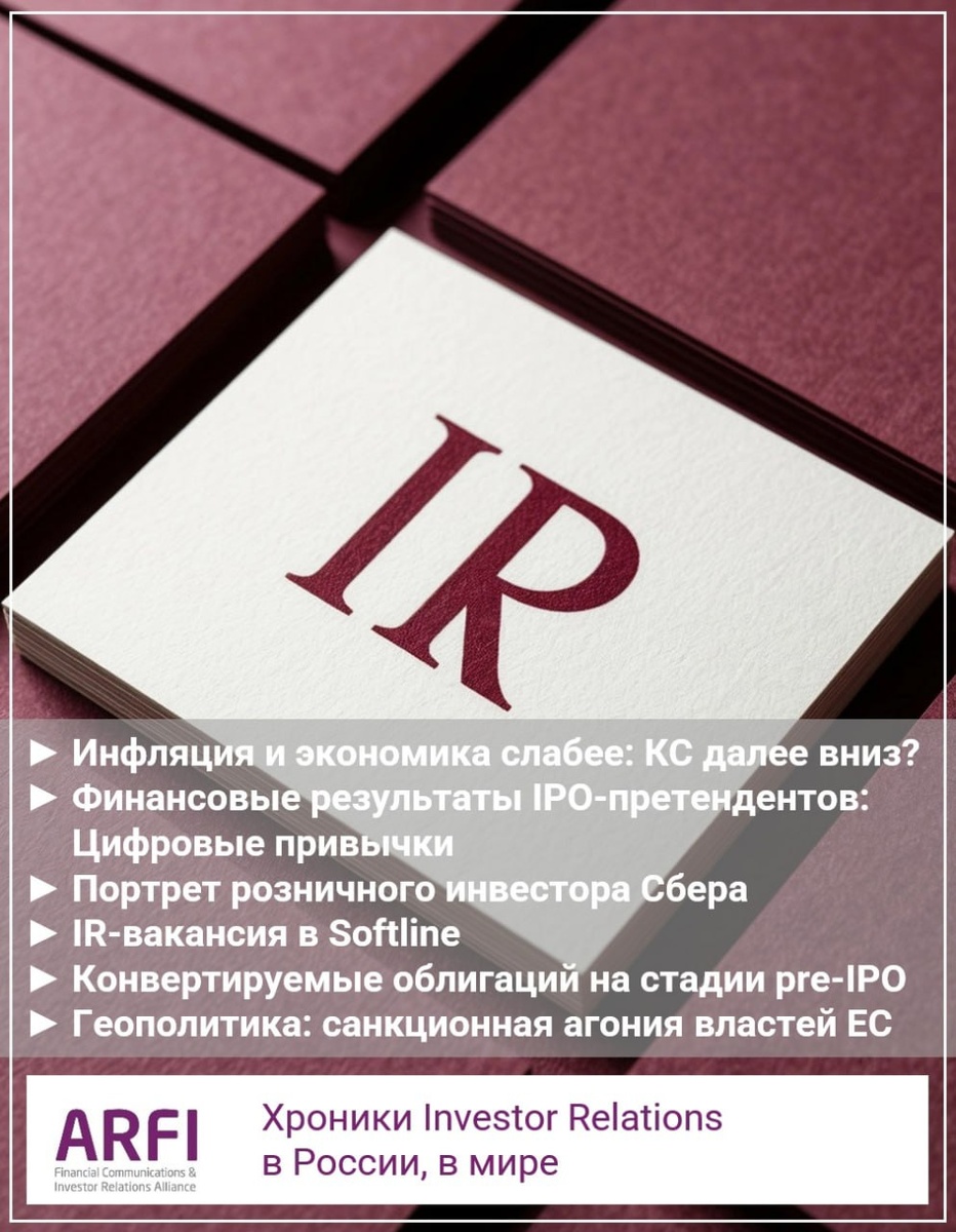 Утренний IR-дайджест 12.06.2025 Формирование условий для следующей волны IPO (продолжение снижения КС летом?) "+" ► Инфляция в РФ с 3 по 9 июня замедлилась до 0,03% с 0,05% неделей ранее (Росстат) "+" ► Годовая в РФ на 9 июня снизилась до 9,73% (Росстат) "+" ► Годовая инфляция в мае снизилась до 9,88% с 10,23% в апреле (Росстат) "+" ► -1% — снижение энергопотребления в РФ с начала года по данным на 11 июня (Евгений Грабчак, замминистра энергетики РФ) "+" ► Грузооборот морских портов РФ в январе-мае 2025 года уменьшился на 4,9% г/г (АСОП) Российские публикации по IR-тематике ► Ключевые кейсы IR в российских реалиях Автор: Ярослав Кабаков ► IR-вакансия: Менеджер по связям с инвесторами Компания: Softline Требования к опыту: 1–3 года Зарплата: не указана Опубликована: 11 июня Финансовые результаты IPO-претендентов ► Цифровые привычки [DGTL] [IPO до конца 2027г] — рост фин.показателей 2024: • ₽1,5 млрд (+97% г/г) — выручка • ₽565 млн (рост 3,4х) — чистая прибыль • ₽6,4 млрд (+47%) — по