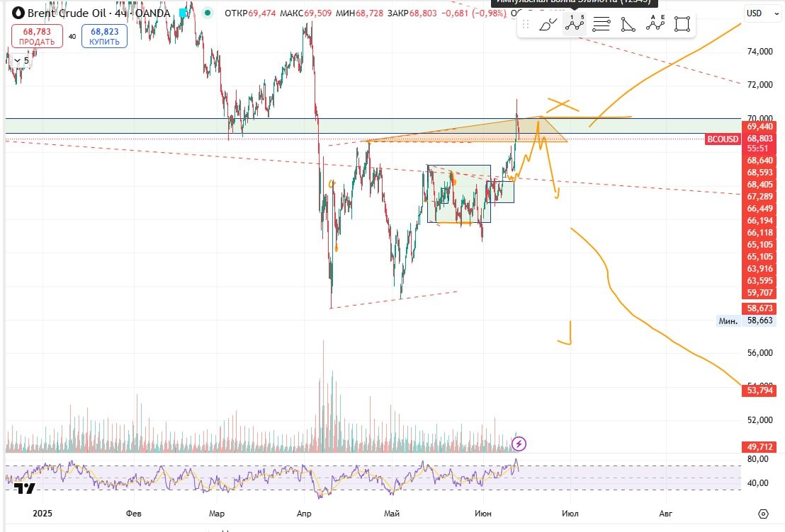 В ответ на пост Нефть - есть прокол 70долларов, на обострении геополитики вокруг Ирана и опасениях перебоя в поставках нефти. Аналитики пишут, что в случае атак на Иран цена может достичь и 120 долларов. Переводим на трейдерский - а может и не достичь) Как правило то, чего больше всего боятся на рынке - не происходит. Поэтому, смотрим на более глобальный технический сценарий и размышляем, куда можно встать с минимальными рисками. Для меня сейчас - это шорт