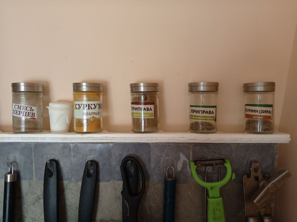 Сначала купила баночки. Потом — специи в пакетиках. Потом вырезала названия из упаковок и аккуратно прилепила скотчем на баночки. Теперь в каждое блюдо идёт минимум 5 специй, и ещё одна – по настроению.