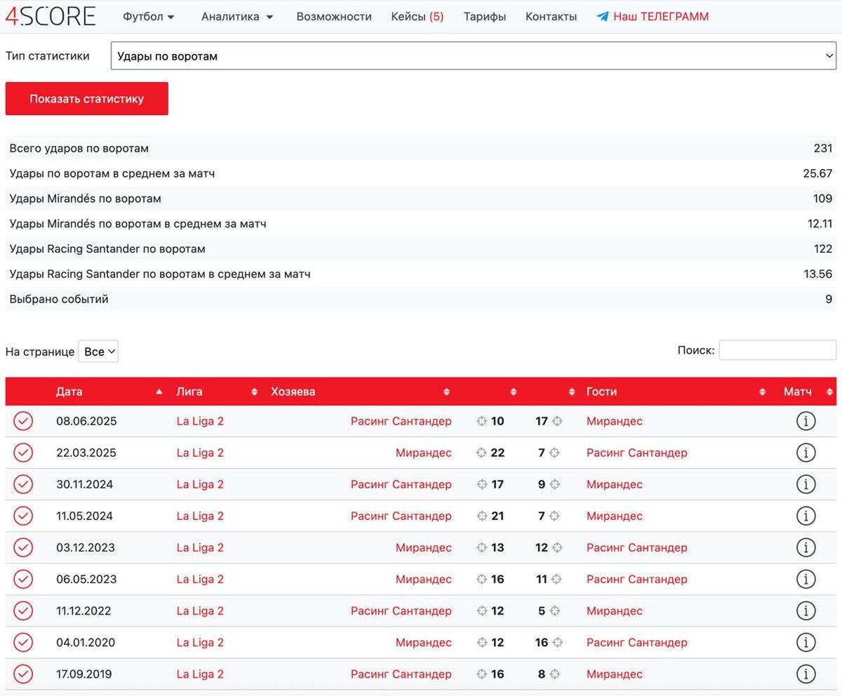 Ла Лига 2. Испания🇪🇸 ⚽️Мирандес - Расинг Сантандер⚽️ 🥅УДАРЫ ПО ВОРОТАМ на основании СТАТИСТИКИ личных встреч 👉Бук даёт ТБ 23.5 за 1.75, на 24.5 коэфф 2.07 😀Я верю, они смогут!