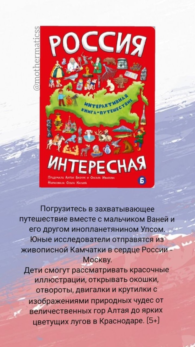 🇷🇺Ловите подборку книг, которые помогают лучше понять нашу страну — её историю, культуру и душу. 📚Они вдохновляют и открывают Россию с разных сторон — для детей и взрослых🖼 🤍Россия интересная 1081₽ 🩵На маленьких крыльях 496₽ ❤️История России 1716₽ 🤍Удивительные места России 663₽ 🩵Народы России 345₽ ❤️Животные России 826₽ 🤍Девочки, прославившие Россию и Мальчики, прославившие Россию 538₽ 🩵Найди и покажи. Россия 151₽ ❤️Россия. Почемучкам и любознашкам 334₽ 🤍Чудеса России 293₽ #книги@mothermaticss