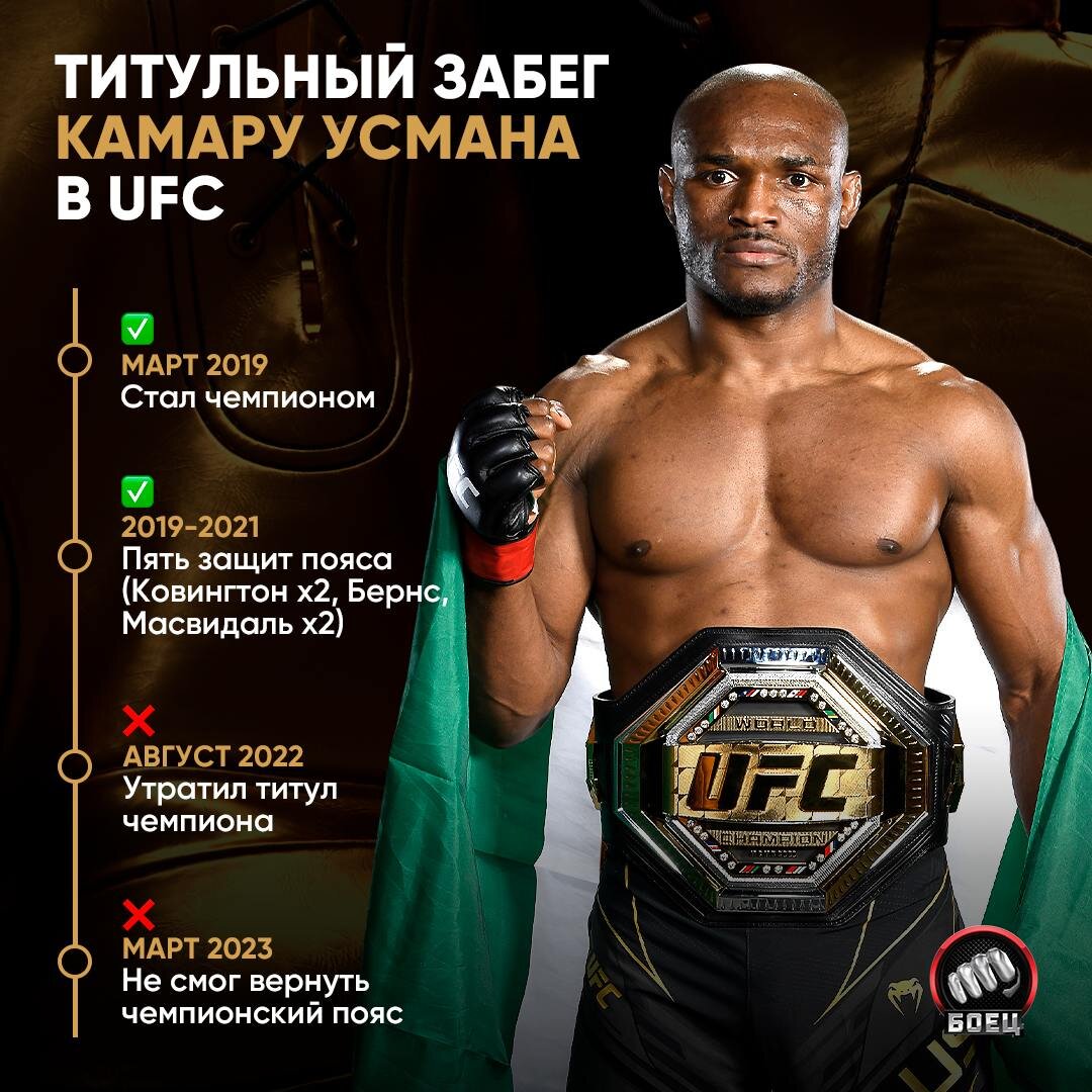 Было время. Вспоминаем пик карьеры Усмана 🏆🔙 Но Камару не собирается останавливаться. У 38-летнего бойца большие планы: 🗣 В эти выходные я собираюсь финишировать Бакли, а потом буду ждать победителя боя Дела Маддалена vs Махачев. 🗣 Ислам поднялся в полусредний вес – это потрясающе. Бывший лидер Р4Р против нынешнего. Мне нравится Ислам, он отличный боец. Этот бой мы оба запомним. Я выиграю, а затем освобожу титул и подерусь с победителем боя Дю Плесси vs Чимаев. 🗣 А если Дрикус все еще будет чемпионом, то мы устроим бой на первом турнире в Африке. Что думаете, сможет Усман продолжить свою чемпионскую историю?