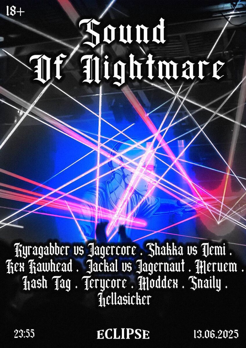 SOUND OF NIGHTMARE 13 июня SOUND OF NIGHTMARE - Здесь вас ждет особая атмосфера и полное погружение в мир габбер культуры. Мы продумали каждую деталь, чтобы сделать тусовку как можно более ярким и запоминающимся событием для всех гостей, готовых окунуться вместе с нами в этот кошмарный сон. Именно поэтому на нашем мероприятии вас ждут: свежий лайн ап, лазерное шоу и дополнительное свето/видео сопровождение, а также мерч от наших артистов, который любой желающий сможет приобрести прямо на входе, и многое другое! LINE UP: Kyragabber vs Jagercore Shakka vs Demi Rex Rawhead Hellasicker Jackal vs Jagernaut Meruem Hash Tag Terycore Moddex Snaily 🎫 Купить билеты FC/DC: 18+ 📆 13.06.2025 в 23.55 📍ECLIPSE, Москва, Переведеновский пер., 21с 1