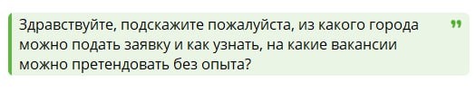 Здравствуйте! Подать заявку можно из любого города, ведь собеседования проходят онлайн. Если у вас нет опыта, всё равно есть шанс на трудоустройство😉 Доступны стартовые позиции: Utility Cleaner / Уборщик Laundry Attendant / Работник прачечной Bar Utility / Помощник в баре Galley Utility / Помощник на кухне Crew Mess Attendant / Помощник в столовой экипажа Restaurant Attendant / Официант шведского стола 📌 Эти позиции дают возможность расти внутри компании. Часто крю начинают именно с таких ролей, а потом вырастают даже до управляющих должностей! Хотите узнать, где больше платят или как начать? Запишитесь на консультацию с нашим менеджером по ссылке https://ismira.bitrix24site.ru/ismira-application/