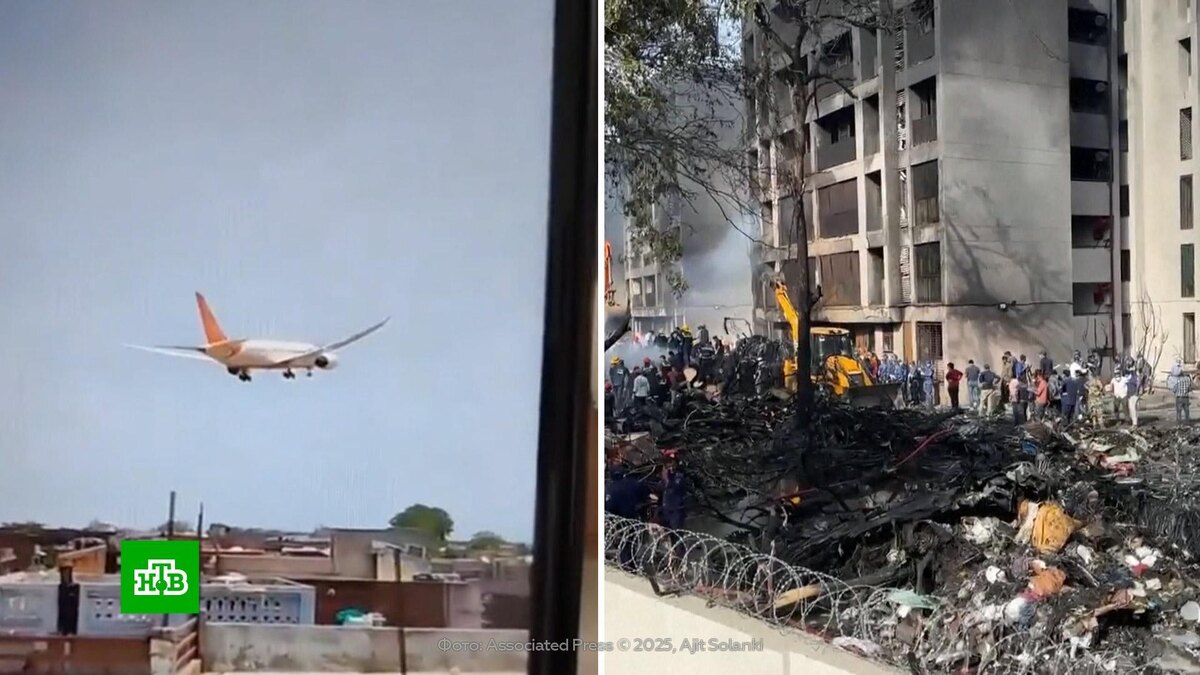 [ Смотреть видео на сайте НТВ ] Пассажирский самолет потерпел сегодня крушение в индийском Ахмедабаде, упав практически сразу после взлета. Момент крушения самолета в Ахмедабаде на западе Индии удалось заснять очевидцам. По официальным данным, Boeing 787 Dreamliner смог подняться на высоту 250 метров, после чего пилоты подали сигнал бедствия, а самолет пропал с экранов радаров. А на кадрах с места происшествия видно, что сразу после падения вспыхнул пожар, несколько кварталов окутал черный дым. Обломки самолета разлетелись на большой территории. Загорелись несколько жилых домов. Одно из крыльев лежало посреди дороги. Основная часть самолета упала на общежитие для врачей. В первые минуты после трагедии в Сети появились видеокадры со спасенными. Вероятнее всего, людей удалось извлечь из-под обломков разрушенных зданий. В полиции города уже сообщили, что выживших в результате катастрофы, скорее всего, нет. Самолет авиакомпании Air India совершал рейс из Ахмедабада в Лондон. Среди пассажир
