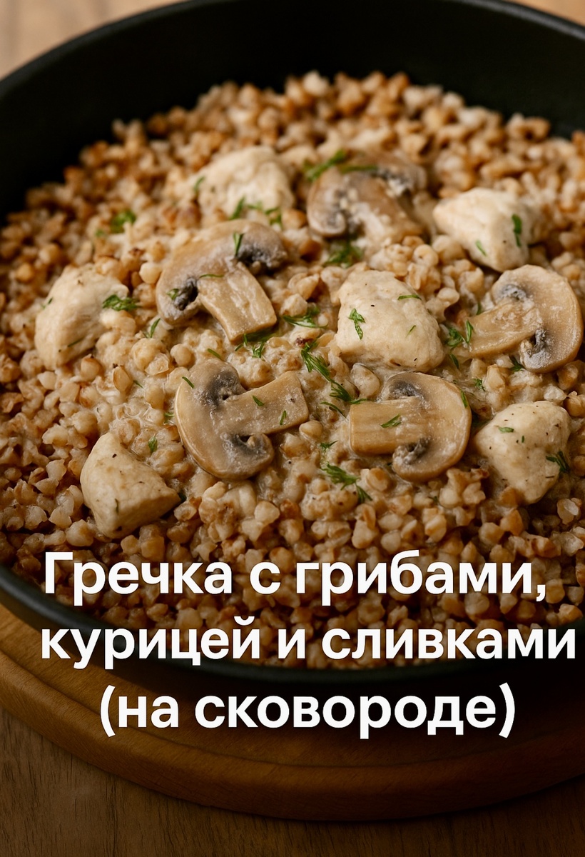 Гречка с грибами, курицей и сливками: уютный ужин на сковороде