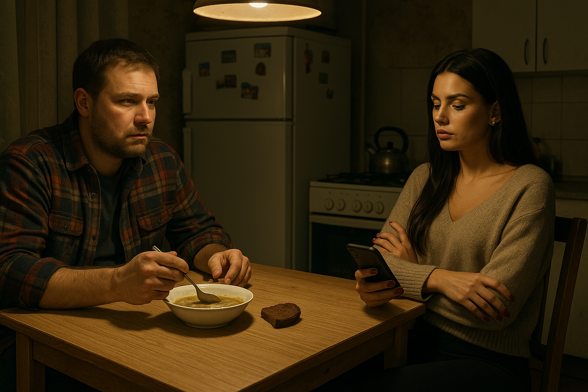 И вот как-то в декабре случилась у них эта история. Максим пришёл с работы усталый, а Катя суп сварила — гороховый, но так пересолила, что есть невозможно. Сидит он, хлебом заедает, а она в телефоне ковыряется.