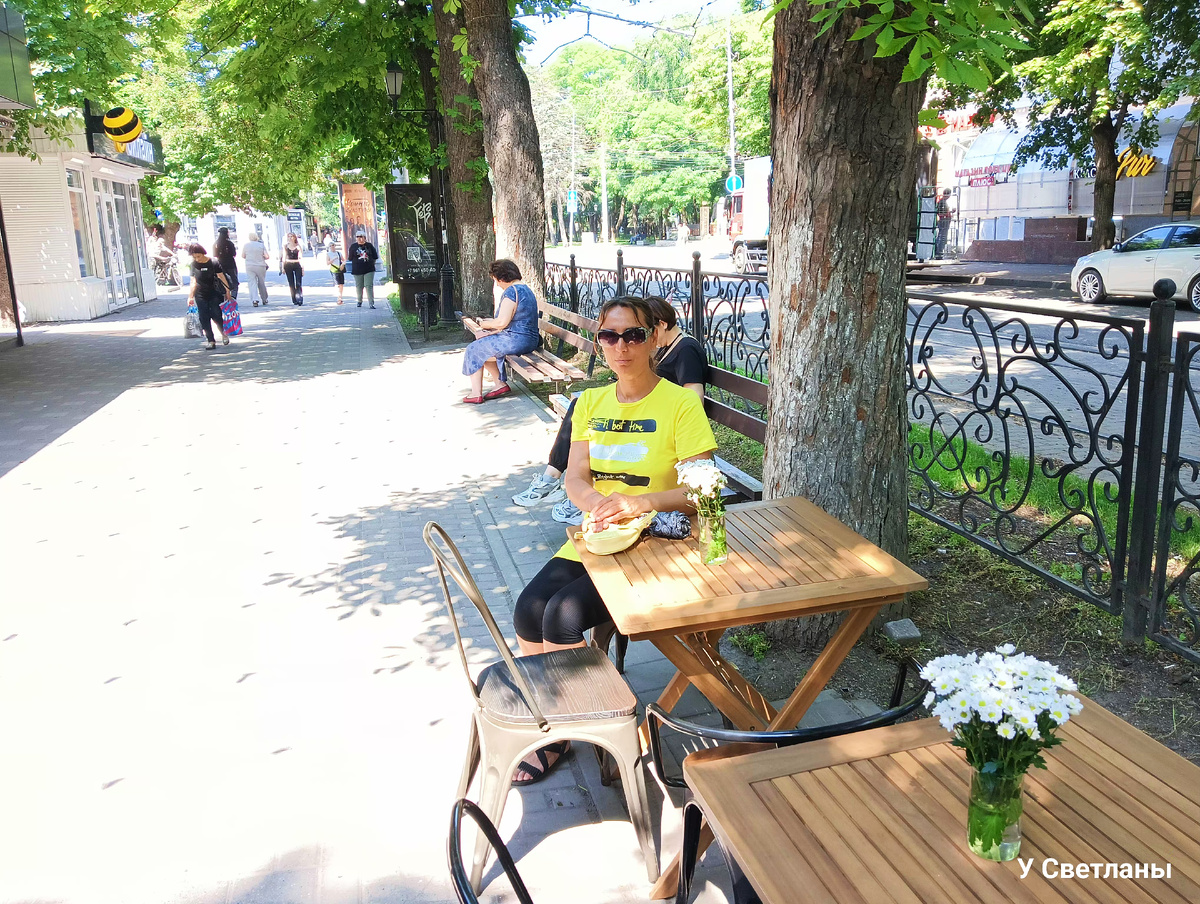 Здесь, две кумушки под зонтиком, скрывшись от жаркого солнца, как и я, общаются между собой, а на столе помечено "Русская душа". 😀