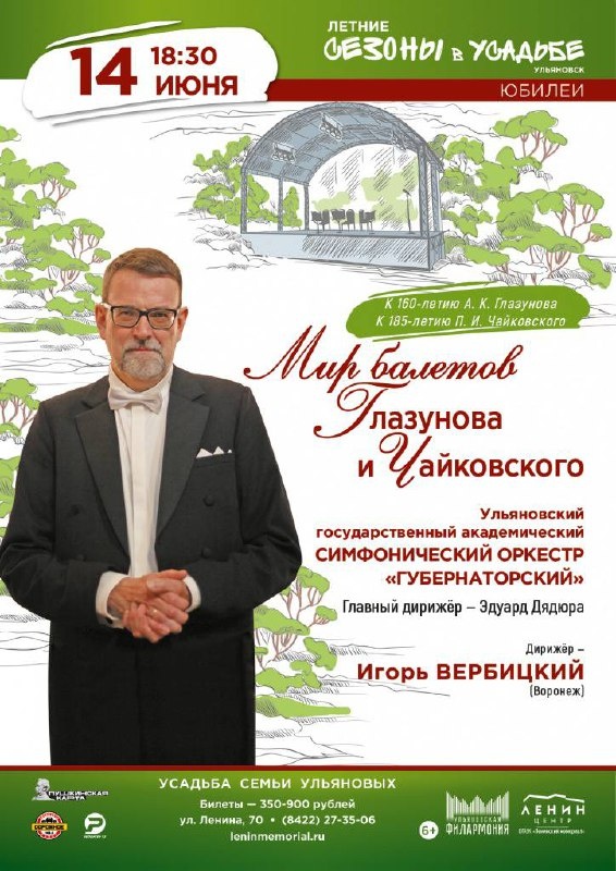 Мир балетов Глазунова и Чайковского 🗓️14 июня в 18:30 📍Городская Усадьба семьи Ульяновых В программе: Александр Глазунов. Сюита из балета «Раймонда»: Первая картина, Антракт, Вальс, Вариация Раймонды, Антракт к 3-му акту Пётр Чайковский. Сюита из балета «Лебединое озеро»: Сцена (1), Вальс, Танец лебедей, Венгерский танец, Испанский танец, Неаполитанский танец, Мазурка Пётр Чайковский. Сюита из балета «Спящая красавица»: Вступление, Адажио, Вальс Подробнее Для вас действует скидка по промокоду культура ✨ #14июня25