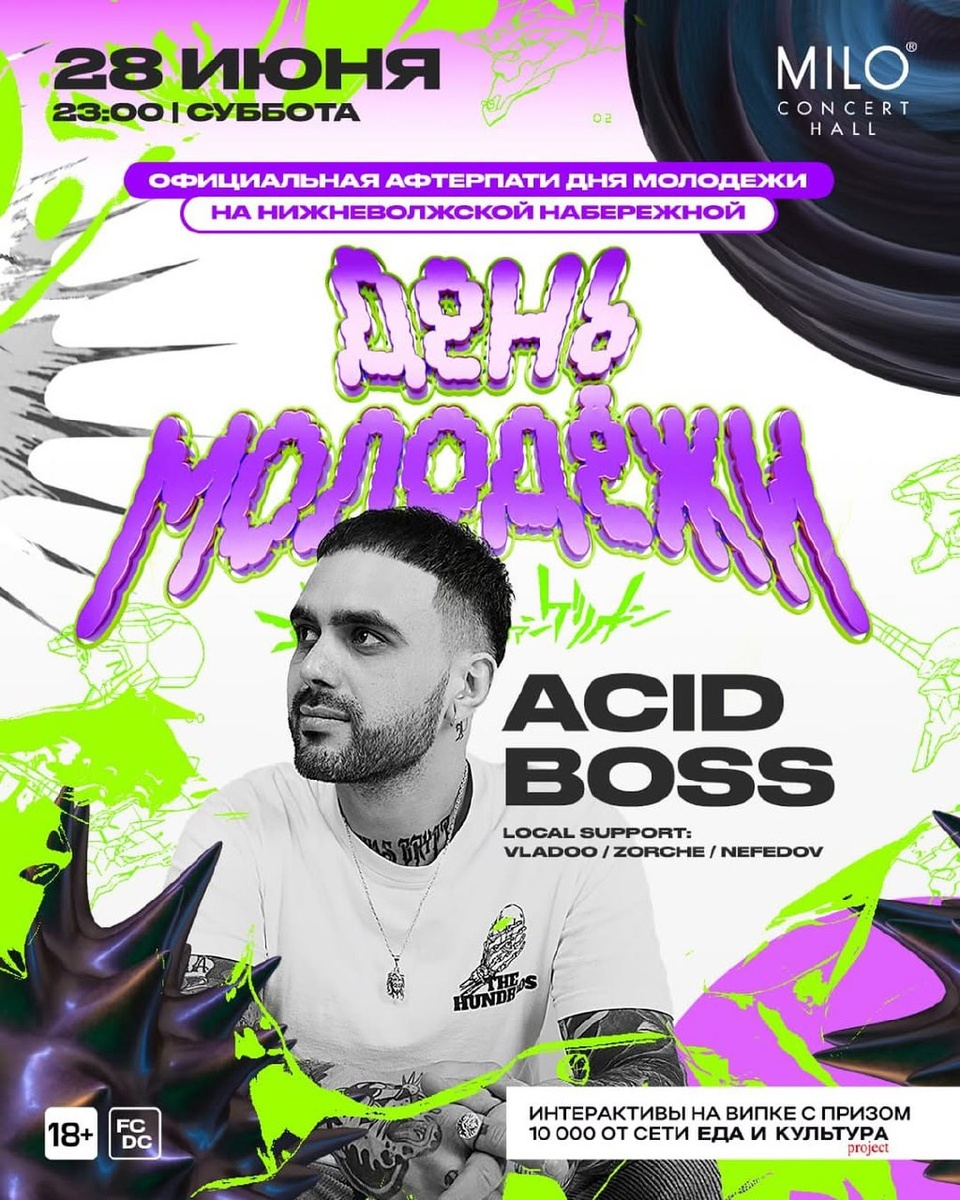 28 июня День молодёжи. Сразу после концерта на набережной afterparty в Milo Concert Hall!! Специальный гость — ACID BOSS (мск). Московский рейв-мессия, бывший Детёныш RAVE и резидент всего, что горит по выходным. Его стиль — как тостер без кнопки «стоп»: жарит до хрустящей корочки. local support: Vladoo / Zorche MC Nefedov #яместный