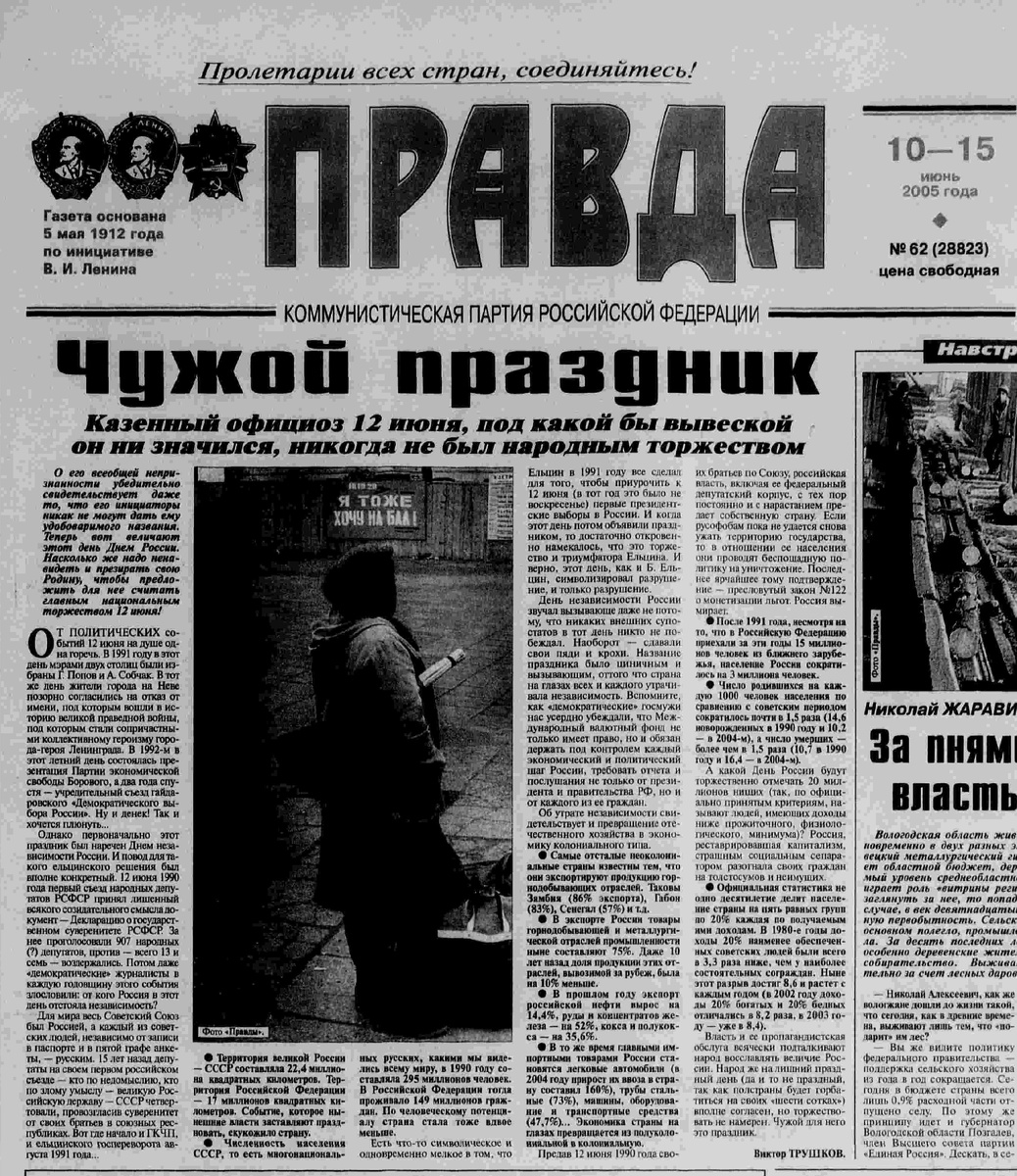 Ровно 20 лет назад, в июне 2005 года, "Правда" опубликовала резкую, бескомпромиссную статью Виктора Трушкова под говорящим названием "Чужой праздник". День России 12 июня в ней представлен как торжество не единства, а распада: символ разрушения СССР, начала экономической зависимости, социального распада и растущей нищеты.