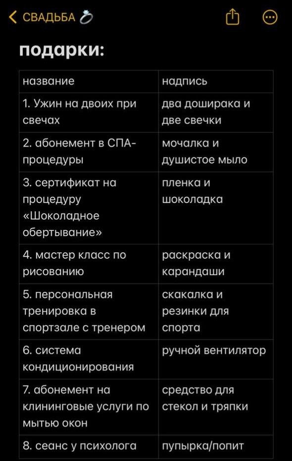 Сегодня в рубрике "Подслушано у невест" будет этот вау-список, если нужно шутливо обыграть подарки гостям. А если ты тоже готовишься к свадьбе, попробуй делать это вместе с нашим комьюнити. Проходить путь подготовки вместе с теми, кто сейчас тоже невеста - это бесценно! Как сказала наша участница-невеста "никто так не поймёт невесту, как другая невеста". Ждём тебя, присоединяйся🫰