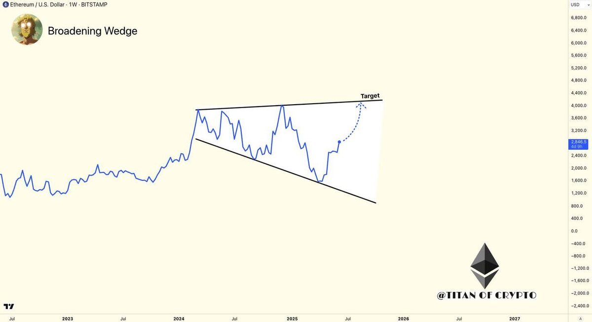 Ethereum в широком клине. Цель — $4200? На недельном графике у ETH формируется “broadening wedge” — расширяющаяся фигура, где амплитуда колебаний растёт, но структура сохраняется. Что важно: — Такой клин — не просто хаос. — Это отражение неопределённости и борьбы крупных игроков. — Но когда структура сжимается к верхней границе — напряжение накапливается. Сейчас мы приближаемся к середине фигуры. Следующая цель — район $4200, верхняя граница клина. Именно там — зона сильного сопротивления и потенциальной фиксации. Что это значит? — Пока биткоин стоит или уходит в боковик, эфир может догонять. — Особенно на фоне обсуждений вокруг запуска стейкинга в ETF и притока капитала в ETH-инфраструктуру. — Но это не «прогноз», а потенциальный уровень, если структура отработает. Если хотите — сделаю серию постов: — как работают такие клины (broadening wedges) — почему они чаще всего появляются на переломных фазах — и как использовать такие структуры без угадайки Ставьте 🔥 если тема интерес