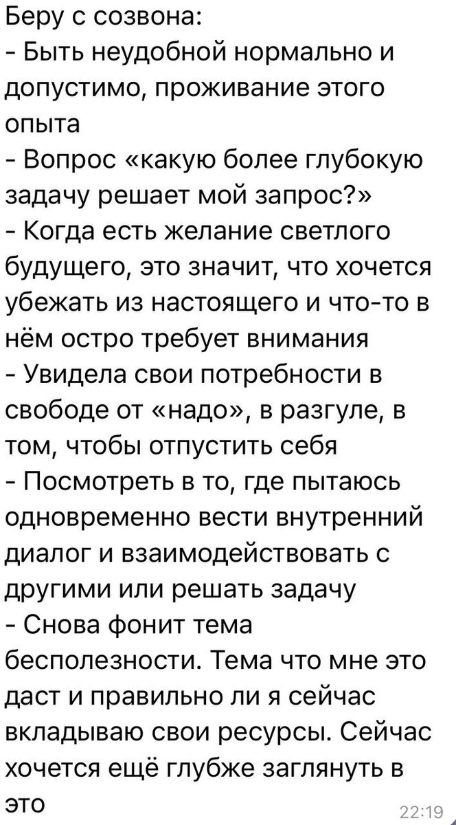 К черту работу над собой, я считаю 🔥 Саморазвитие зашло не в ту дверь и вместо счастливых людей сделало закопавшихся, тревожных, неживых. Следствие того, что неплохие идеи легли на фундамент самоабьюза. И вместо свободы получаются Страх быть видимой / заявить о себе Неуверенность в своих талантах и цене Зажатость в общении / страх мнения других Фоновая тревожность, ощущение “я недостаточна” Сравнение, зависть, самокопание Страх безденежья / “мне за это не заплатят” Прокрастинация после ошибок / страх «не справлюсь» Никто не хочет работать над собой и это не нужно. Можно просто узнать себя, свою тень и прийти к Уверенности и спокойствию “я могу” К тому чтобы Зарабатывать любимым делом Чувствовать себя цельной и настоящей Смело говорить о себе, не краснея Быть видимой и... не теряться Доверять себе и миру Радость от проявленности Отпустить контроль и жить вкусно И к новым деньгам как итог. Новое знание себя = новые деньги. Ведь пока вы не знаете что правит балом