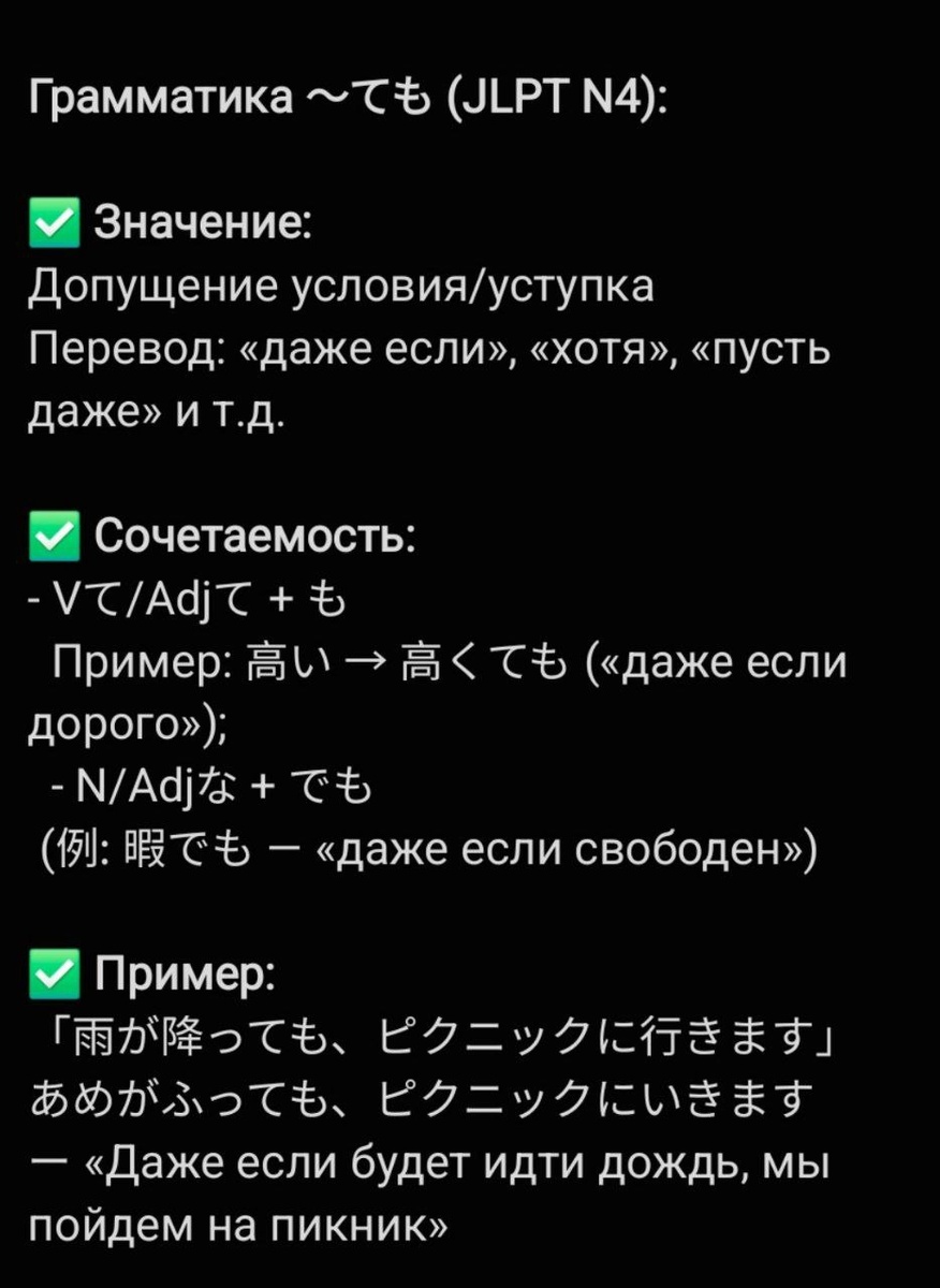 Грамматика ~ても (JLPT N4): ✅ Значение: Выражает допущение условия или уступку. Переводится как «даже если», «хотя», «пусть даже». Часто используется, чтобы показать, что результат не изменится, несмотря на условие ✅ Сочетаемость: - Глагол/прилагательное на いв て-форме + も Пример: 高い → 高くても («даже если дорого»); - Для существительных и な-прилагательных: ~でも (例: 暇でも — «даже если свободен») ✅ Примеры: 「雨が降っても、ピクニックに行きます」 あめがふっても、ピクニックにいきます ー «Даже если будет идти дождь, мы пойдем на пикник» 「お金がなくても、幸せになれます」 おかねがなくても、しあわせになれます ー «Даже без денег можно быть счастливым» #грамматика #JLPT_N4